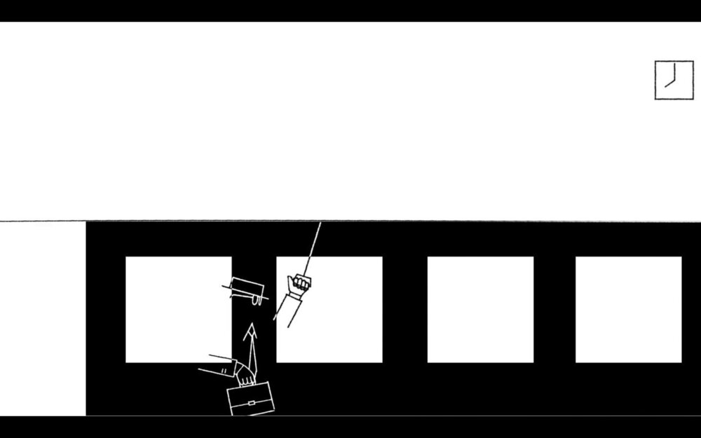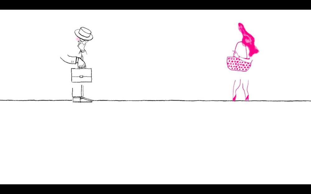 Sürekli soldan sağa seyahat eden çizgi, kahramanı evden işe götürüyor, yolda yürütüyor, iş yaptırıyor, ve yatırıyor. Gün bitiyor ve çizgiyle gün yeniden devam ediyor. Ta ki pembe çizgili esas kadın gelene kadar. Oradan sonra işler bazen düğüm oluyor. Adeta iki çizgi kulaklık gibi birbirine dolanıyor. Bir anda çizgiler siyah-beyaz ve köşeliden renkli ve yuvarlak hatlara sahip bir şekle bürünüyor. Ve tabii ki de karakterler aşık oldukça çizgi hızlanıyor, yani karakterlerin arasındaki duygudurum değişikliklerine göre hızı değişiyor hikayenin.
