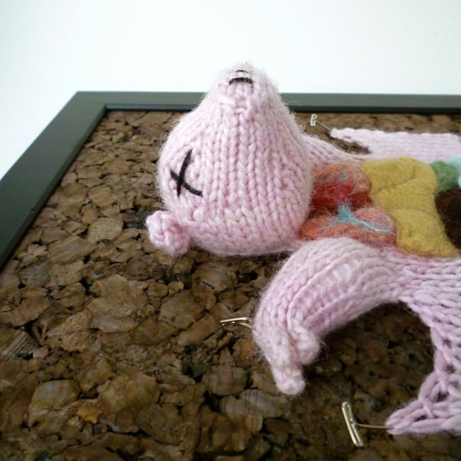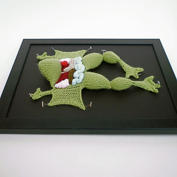 Tamamı örgüden yapılan seride, lise biyoloji derslerinden kalma “kurbağa inceleme” gibi tatsız deneyimler, birçoğumuzun etik olarak karşı çıktığı, rahatsız olduğu görüntüler, olabilecek en sempatik haliyle yeniden yaratılmış ve bu defa kafanızı çevirmek yerine alıp duvara asacağınız güzellikte çalışmalar ortaya çıkmış.