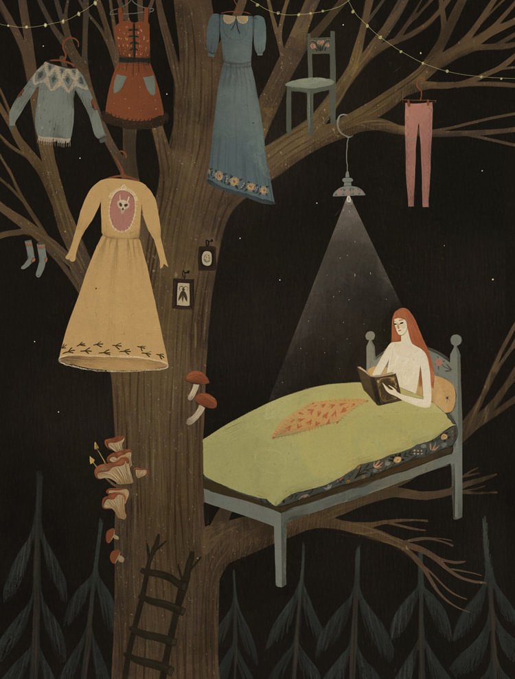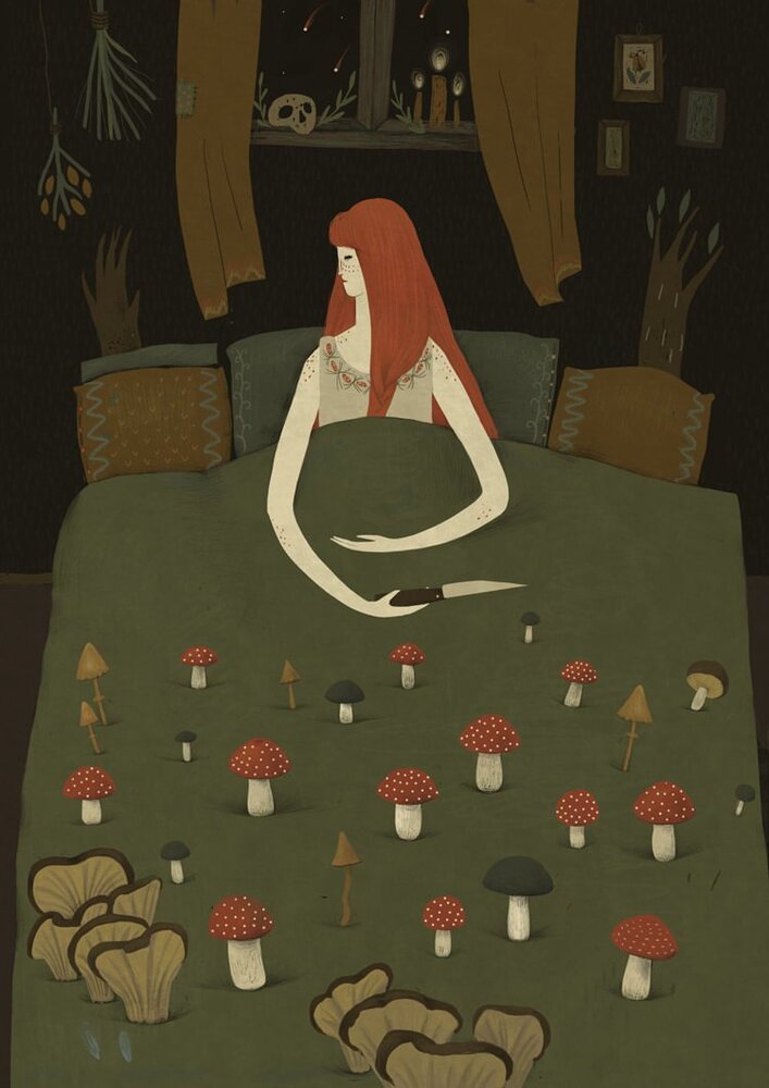 Yaşam alanlarımız ve yaşam biçimlerimiz doğadan o kadar ayrı düşmüş durumda ki pek çoğumuz doğayla tekrar bir araya gelebilmek için fırsat kolluyoruz. Hatta hayallerimizi bir gün şehri terk edip doğayla iç içe yaşamak üzerine kuruyoruz. Doğa adeta manevi ve bedensel anlamda bize aradığımız huzuru verebilecek sihirli ama ulaşılması güç bir iksir gibi. Jin Xingye’nin Green adlı illüstrasyon serisinde insanın ve doğanın temas kurduğu masalsı sahneler bu nedenle oldukça ilgi toplamıştı. Rus İllüstratör Alexandra Dvornikova da ormanın derinliklerine dalarak kimi zaman hayvanlara, kimi zaman bitkilere – özellikle de mantarlara- kimi zaman insanlara kimi zaman da bunların tamamına odaklanan illüstrasyonlar üretiyor. Çalışmalarının bazıları da GIF formatında.