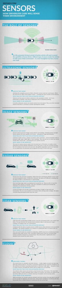 Otonom araçların kendi kendilerine trafikte yol alabilmeleri için birkaç önemli bileşenin bir araya gelmesi gerekiyor. Bunların belki de en önemli iki tanesi: çok detaylı algılayıcılar (sensörler), ve algılayıcıların toplandığı devasa veriyi hızla işleyebilecek bir işlemci ve yazılım. 2025 AD sitesi bugün yollarda olan kimi test aşamasında, kimi prototip otonom araçların kullandığı sensörleri bir infografikle açıkladı. Ultrason sensörleri, görsel sensörler, radar ve lidar sistemleri bu araçların etraflarını algılamaları için zorunlu araçlar. Tüm bu sensörlerin çalışma şekilleri için grafiği inceleyebilirsiniz.