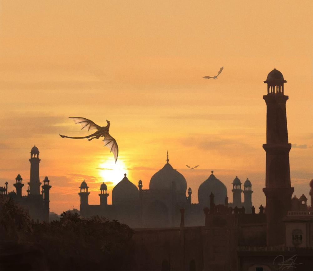 Çizimlerde, geleneksel Pakistan hayatından görüntüler var: Çekçek adı verilen üç tekerlekli taksiler, süslü kamyonlar, İslam mimarisi, Pakistan’a özgü kıyafetler, nargileler, dansözler… Hepsi orada. Ancak bunların yanında son derece beklenmedik detaylar da görülüyor. Örneğin, uçan kamyonlar, uzay gemileri, hologramlar… Gelenekselle fütüristik öğeler bir arada şahane bir şekilde harmanlanmış olarak hayat buluyor ve insanı adeta paralel bir evrene taşıyor.