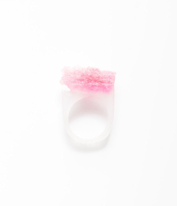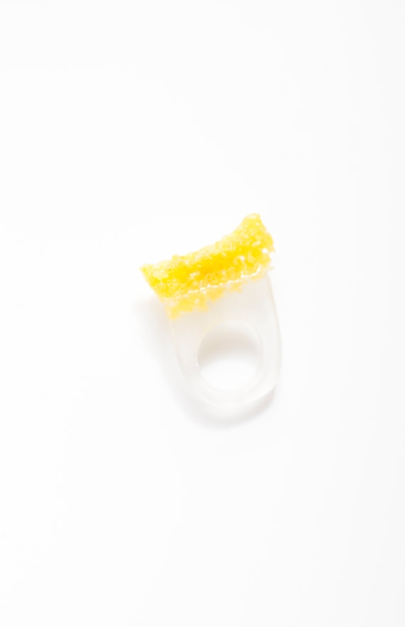 Hollandalı mücevher tasarımcısı Martine Poot’un imzasını taşıyan koleksiyondaki el yapımı yüzüklerin ilk bakışta değerli taşlardan yapıldığını düşünebilirsiniz. Ancak; sarı, kırmızı, mavi, mor gibi birçok renk seçeneği olan yüzükler reçine ve pamuk şekerden yapılıyor.