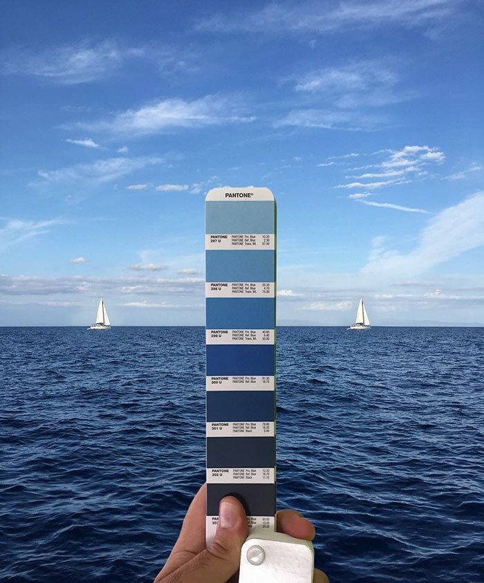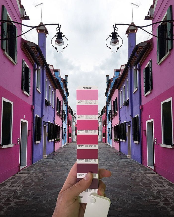 İtalyan grafik tasarımcı Andrea Antoni, yaklaşık 50 haftadır düzenli olarak dünyanın en prestijli renk kartelalarından Pantone ile İtalya’dan doğa manzaralarını üst üste koyuyor. İtalya’nın renkli binaları ve doğası eşliğinde Antoni, bir eline kartelayı alıyor ve arka fonu o renklerle dolduruyor.