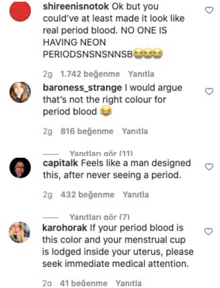 Bu kadar canlı bir rengin regl kanını temsil etmediğini ifade edenler görüşlerini sosyal medyadan paylaşıyor. Pantone’un ve INTIMINA’nın sosyal medya gönderilerinin altında ve diğer sosyal medya paylaşımlarında bu seçimi ketçap rengine benzeten, adet dönemi kanınız böyleyse doktora gitmelisiniz diyen, feminizme yönelik şirin ve sahte bir girişim olduğunu düşünen kişiler bulunuyor.
