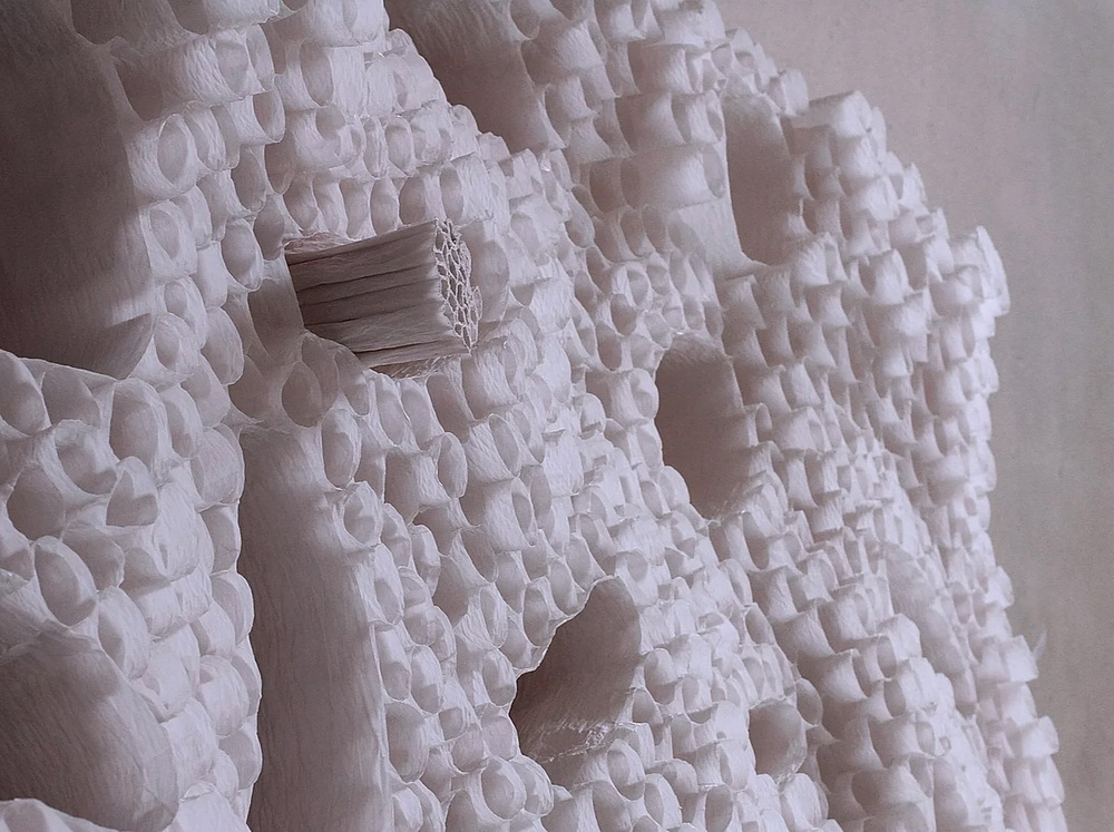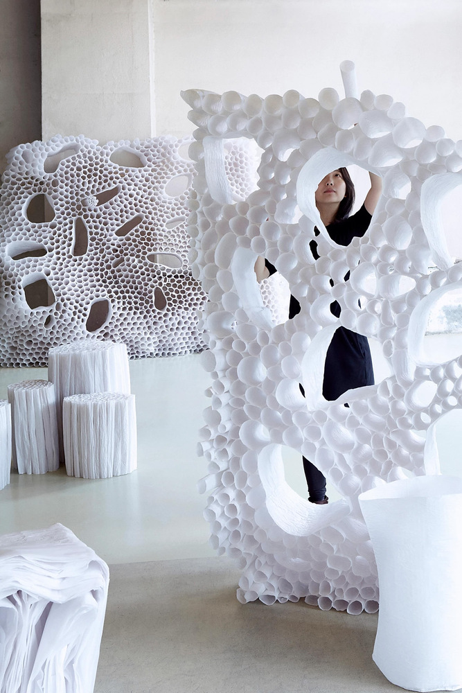 Tasarımcı bu projeyle kağıdın işlevselliğini yeniden gözden geçirmeyi ve sıra dışı potansiyelini keşfetmeyi hedeflemiş. Tasarımların sağlamlığını artırmak için farklı boyutlarda kağıt rulolar kullanmış. Pirinç suyu hem sertleştirici hem de tutkal işlevi görüyor. Sadece malzeme açısından değil, estetik açıdan da oldukça farklı bir doku yakalamayı başarmış. Böylece ortaya sanat eseri gibi parçalar çıkmış. Zaten tasarım galerilerinin yanı sıra sanat galerilerinde de sergilenen çalışmaları var.