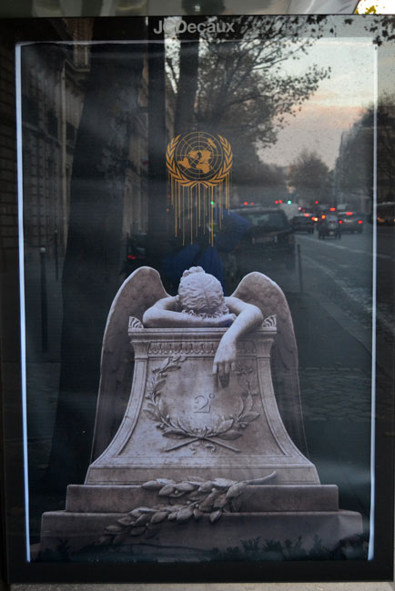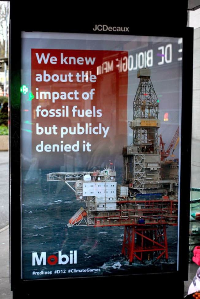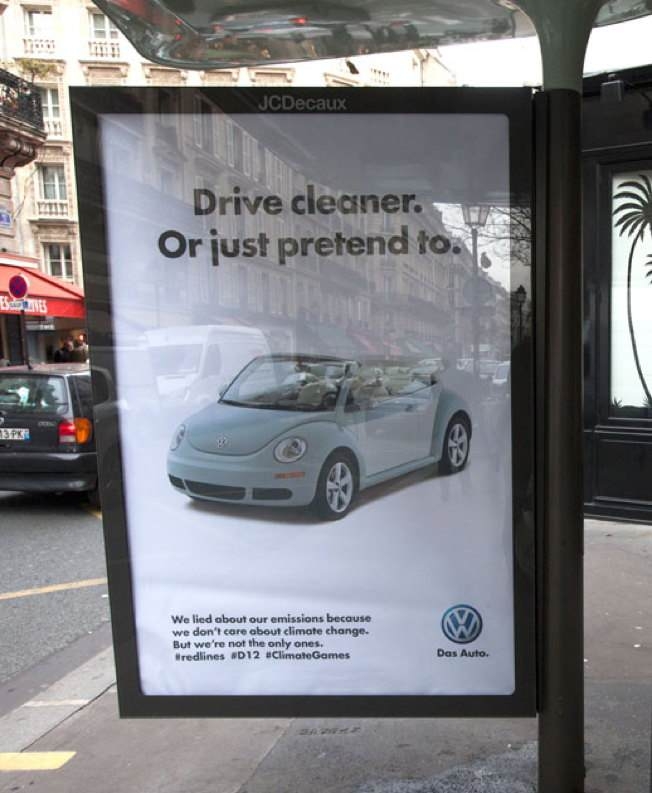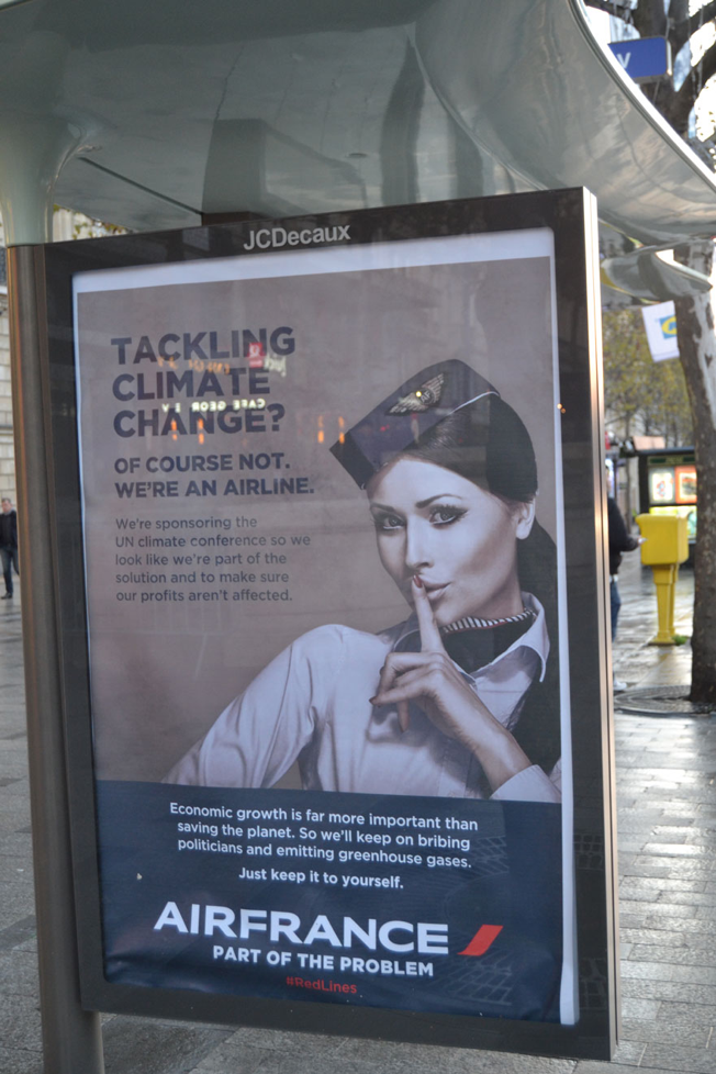 Aralarında Total, Air France, Dow Chemicals, GDF Suez ve Volkswagen’ın da bulunduğu sponsor markaların iklim değişimiyle aralarındaki gerçek bağı ortaya koyan korsan faaliyet, yeni yapılan alternatif (ve daha gerçekçi) posterlerle ortaya kondu. Bu arada grubunu, posterleri astığı 600’ün üzerindeki açıkhava panosu da yine İklim Zirvesi’nin sponsorlarından JC Decaux’a ait.
