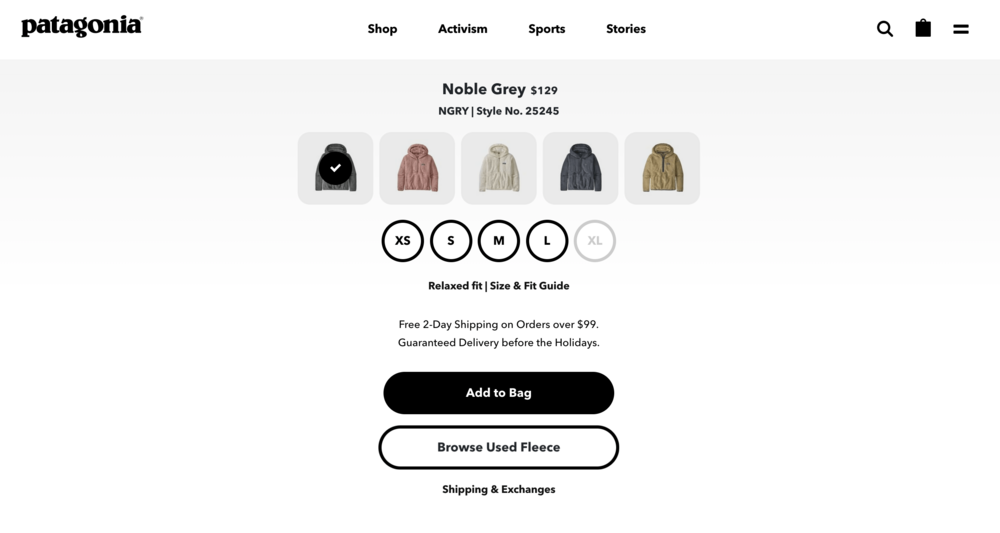 Patagonia’nın Black Friday’de başlattığı bu uygulama, müşterileri yeni almayı düşündükleri eşyaların ikinci el sürümlerini satın almaya teşvik ediyor. Şirket bunu, patagonia.com’da listelenen her yeni ürünün altına “kullanılmış olanlarına göz at” seçeneği ekleyerek yapıyor. Örneğin bir hırkanın satın al butonunun hemen altında, tüm kullanılmış hırkalara göz atabileceğiniz browse used fleece (kullanılmış hırkalara göz at) butonu yer alıyor. Bu buton da ziyaretçiyi Worn Wear mağazasındaki kullanılmış Patagonia ürünlerine yönlendiriyor.