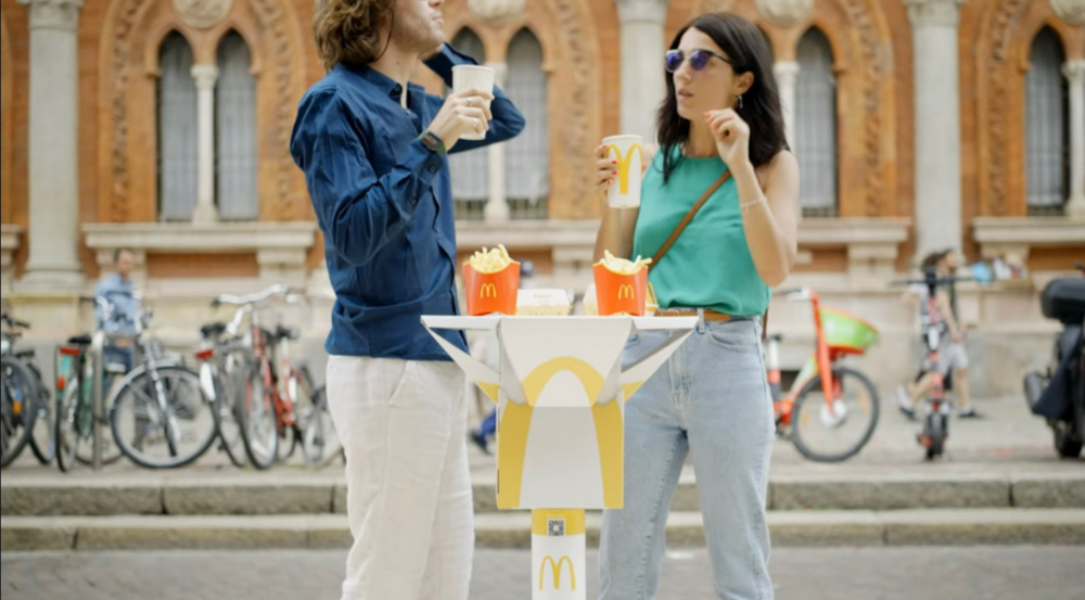McDonald’s İtalya, yaklaşık 400 bin kişiyi ağırlayan Milano Tasarım Haftası sırasında uzun restoran kuyruklarında beklemek zorunda kalanlar için pratik bir müşteri deneyimi tasarladı. Leo Burnett İtalya iş birliğiyle hazırlanan TableBag adlı çalışmada, paket servis kutuları yemek masalarına dönüştürüldü. Yenilikçi ambalaj tasarımıyla müşterilerini ellerinde yiyecek paketleriyle dolaşmaktan kurtaran McDonald’s, böylelikle açık havada masa bulunmayan tüm alanları restoran konseptine dahil etmiş oldu.