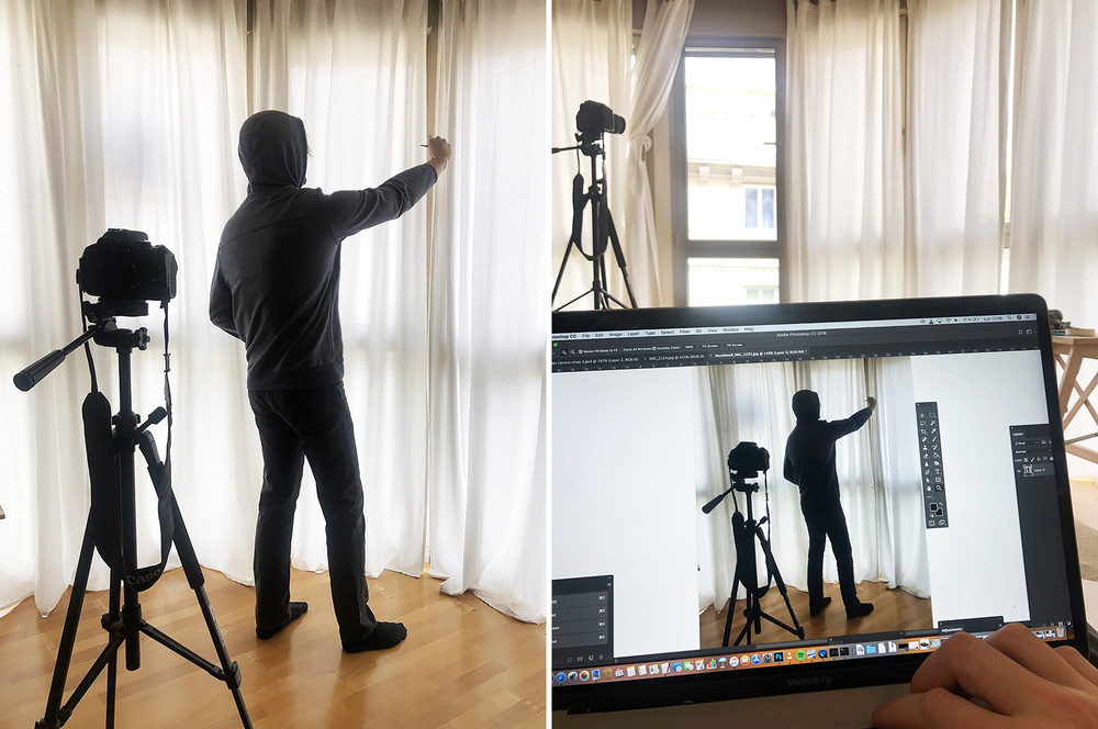 Sanatçı insanların yapım sürecini kavrayabilmeleri için basit kılavuzlar da paylaşıyor. Bu paylaşımlarda, sanatçının ilk önce koyu renkli kıyafetlerle istediği pozda kendi fotoğrafını çektiği görülüyor. Ardından bu fotoğraftaki silüeti bilgisayar ekranının üzerine koyduğu bir kağıda çizerek aktarıyor. Daha sonra çizimi kesiyor ve cama çizeceği figür için şablon olarak kullanıyor.