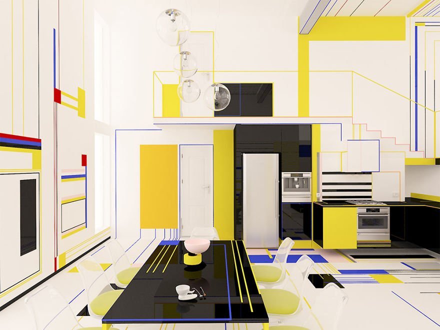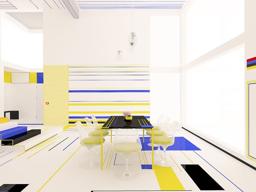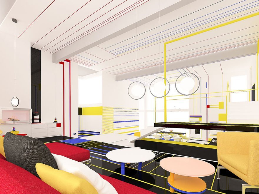 Mondrian esintili daire, Brani & Desi’nin tutkulu tasarımcıları Branimira Ivanova ve Desislava Ivanova’nın imzasını taşıyor. İkili, dairenin Mondrian’ın aklını ve hayal gücünü temsil etmesini hedeflemiş. Aslında esinlenmekte öte, tasarım bizzat tablonun kendisi gibi görünüyor.