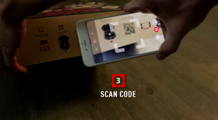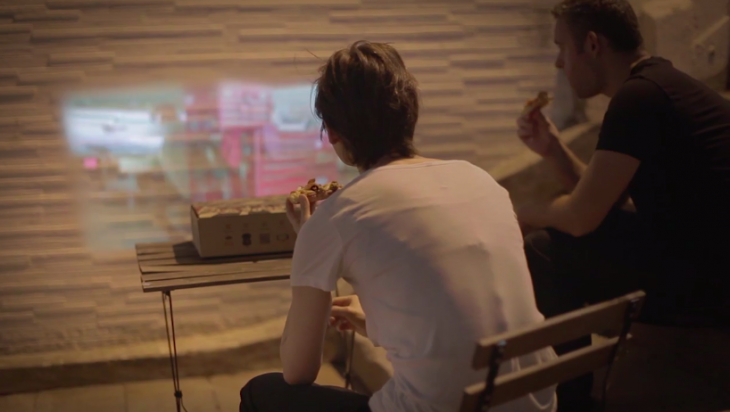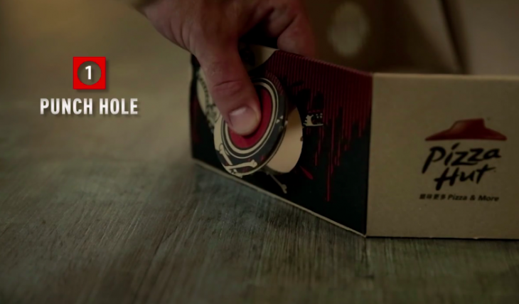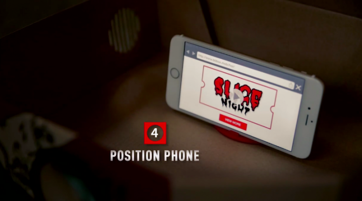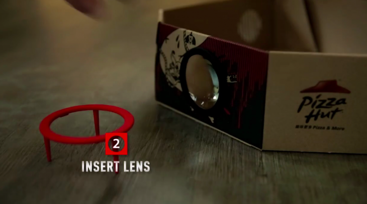 Şöyle ki; pizza kutusunun kapağı pizzaya yapışmasın diye kullanılan plastik ayak üzerinde size bir lens gönderiliyor. Kutunun üzerindeki tırtıklı yeri elinizle çıkartıp projektörün çıkışını oluşturuyorsunuz ve lensi plastik ayaktan alıp bu deliğe yerleştiriyorsunuz. Akıllı telefonunuzla kutunun üzerindeki kodu okutunca filminiz telefona yüklenmeye başlıyor. Telefonu alıp plastik ayağa yerleştiriyorsunuz ve kutunun içinde lense karşılık gelen yere koyuyorsunuz. Veee yazlık sinema havasında pizzanızı yiyorsunuz.