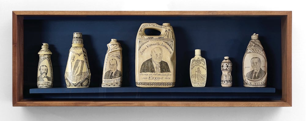 1860’larda ABD’de aydınlatma amacıyla kullanılan balina yağının yerini, gazyağı aldı. Balinalara uygulanan vahşetin yerini bir başka felaket almaktaydı çünkü ülke büyük bir hızla fosil yakıtlara geçiş yapıyordu. Vahşetten geriye kalan şey fildişi oymacılık ya da bezek olarak bilinen büyük ölçüde denizcilikle bağlantılı olan bir sanat biçimiydi. Sanatçı Duke Riley, bu tarihi gerçeklere ve onun modern zamandaki etkilerine çalışmalarında geniş bir şekilde yer veriyor. Onun işlerinde bol bol balinaları, diğer deniz canlılarını, endüstriyel gemi hikayelerini ya da konuyla alakalı kişilerin portrelerini görmek mümkün.