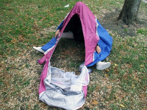 Yürüyen çadır mobil pop-up çadıra dönüşen bir çift spor ayakkabı projesi. Tasarım grubu Sibling tarafından geliştirilen ayakkabının kenarlarındaki ceplerden çekilen çadır tam teşekküllü, dışarı çıkarıldığı gibi ayak hizasından itibaren yukarı doğru bir insan boyunca kolayca açılıp kuruluyor. Projede insan vücudu destekleyici yapı olarak kullanılıyor ve şehir hayatına yeni bir alternatif sunuyor.