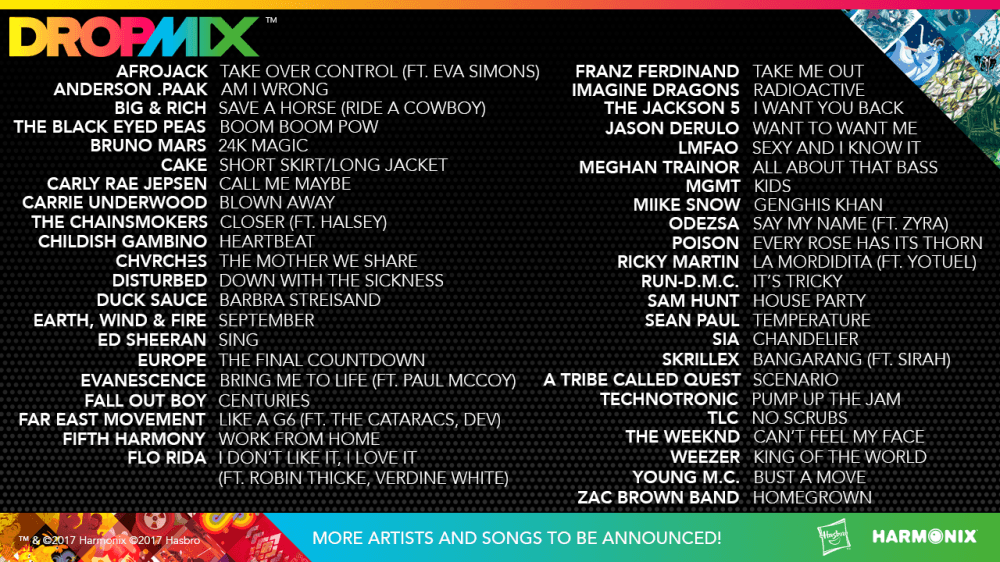 Parçaların davul, klavye, vokal ve gitarlarını kullanarak adeta mini bir kart oyunu gibi çalışan Dropmix, 13 – 15 Haziran’da düzenlenen E3 ile birlikte 10 yeni parça ve Parti Modu eklendi. Bu parçalar arasında Anderson .Paak ve Schoolboy Q’dan Am I Wrong, Black Eyed Peas’ten Boom Boom Pow, Evanescence’tan Bring Me To Life, Far East Movement’tan Like A G6, MGMT’den Kids gibi farklı türlerden hem anılarımızı su yüzüne çıkarıyor hem de günümüz isimlerini platformuna taşıyor. Dropmix’in yeni duyurulan bu eklentileri önümüzdeki sonbaharda piyasaya çıkacak.