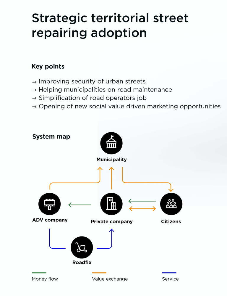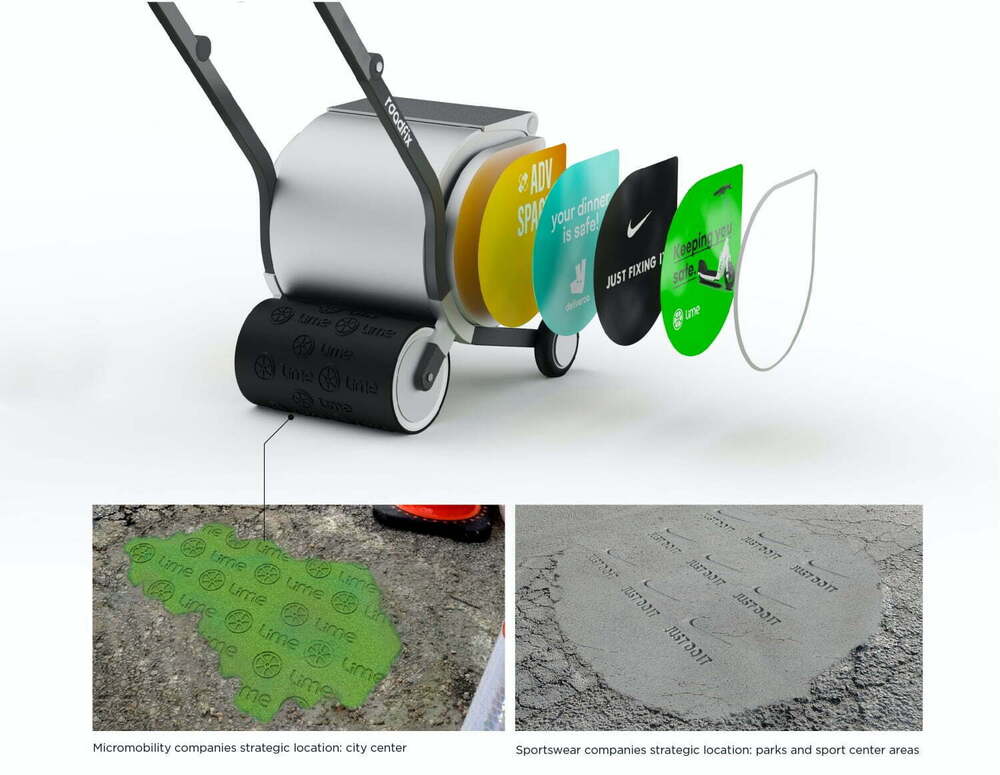 Bu portatif araç, belediyelerin daha düşük maliyetle ve hızlı bir şekilde yol yapım çalışmalarını gerçekleştirmesine yardımcı olmasının yanı sıra reklamverenler için de alternatif bir reklam alanı seçeneği sunuyor. Markalar Roadfix cihazının silindirine uygulayacakları baskılı logolarla onarıma sponsor olabiliyor. Bu da belediyelerin onarım masraflarını karşılamasına yardımcı oluyor.