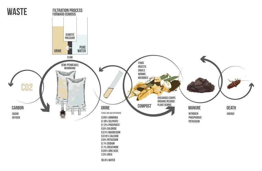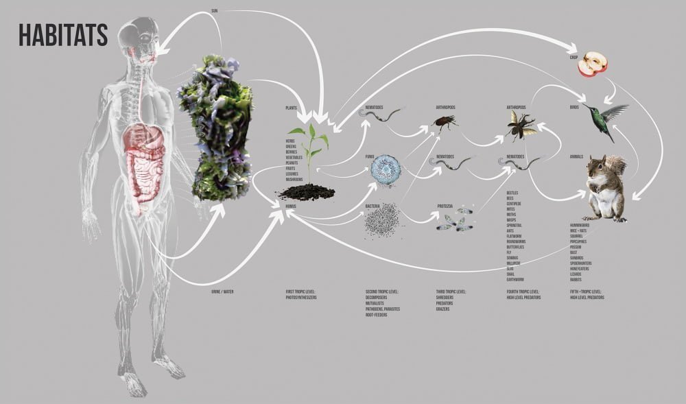 Foreground bu tasarımda, küreselleşmiş gıda endüstrileri ve bunların sürdürülebilir olmayan karbon ayak izleri hakkında artan farkındalığa bağlı olarak gıda üreticisini ve tüketiciyi temsili olarak yeniden birleştirmeyi hedeflemiş. Foreground’a göre şiddetli kuraklık ve sanayileşmiş tarım nedeniyle düşen toprak kalitesinin yanı sıra deniz seviyesinin yükselmesi ve iklim olayları da hepimizi gıda üretiminin geleceği hakkında daha fazla düşünmeye zorlayacak. Posthuman Habitats’ta önerilen mikro yaşam alanları, kent sakinlerinin medeniyetten uzak yaşamasını -temsilen de olsa-mümkün kılarken ona doğaya ve yiyecek kaynaklarına anında erişim sağlıyor.