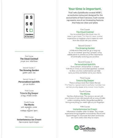 RPA ajansıyla iş birliği yaparak San Fransisco ve Los Angeles’ta gezici restoranlar kurarak yaklaşık 500 muhasebeci kullanıcısının buralarda karınlarını doyurmalarını sağladı. Gezici restoranların en tatlı tarafıysa yazılımın zaman kazandıran özelliklerinden ilham alarak sunduğu menüydü denilebilir.