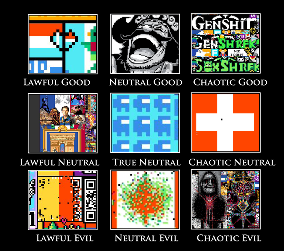 Bu dört günde kendi hikayesini ve karakterleri yaratan r/place için FRP oyunlarında kullanılan ve kişinin iyi-kötü ile adil-kaotik eksenlerindeki konumunu belirleyen “alignment chart” üzerine de etkinliğin akılda kalan büyük topluluklarını yerleştirdiler. Etkinlik bittikten sonra bile meme’ler, saygı duruşları, referanslar ile r/place’in 2. edisyonu uzunca bir süre daha anılacak. Ve evet hemen her topluluk tasarımları için bot kullandı.