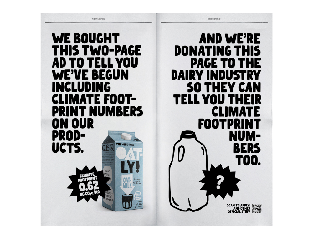 2021 yılında ‘Show Us Your Number‘ kampanyası ile gıda sektörüne meydan okuyan süt ve süt ürünlerine bitkisel bazlı alternatifler sunan Oatly, bu kez hedef tahtasına hayvansal süt ve süt ürünleri markalarını aldı. Hazırladığı basılı reklam kampanyasında kendi karbon ayak izi istatistiklerini yayınlayan şirket, reklam alanının diğer yanını süt şirketlerine ayırdı. Ayrılan boş alanın ücretini süt şirketleri için ödeyeceklerini duyuran Oatly yetkilileri, karşılığında süt şirketlerinden karbon ayak izlerini şeffaf bir şekilde açıklamalarını istiyorlar.
