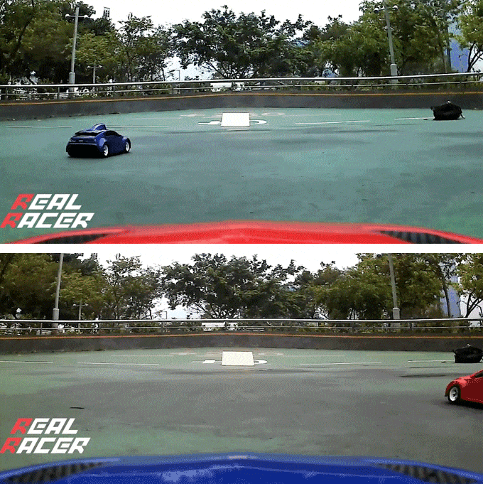 FPV (first person view) terimi; araç üzerindeki bir kameradan gelen sinyallerle görüntü veren bir gözlük veya ekran yardımıyla sanki aracın içindeymişsiniz gibi görmenizi sağlayan bir sistem. “Birinci kişi görüş açısı” gibi Türkçeye çevirebileceğimiz bu sistemin adını, son zamanlarda drone’larla da sık sık duymuş olabilirsiniz. Bu sistem uzaktan kumandalı yarış otomobillerinde de kullanılıyor. Real Racer’ın en önemli özelliği de FPV sürüşü sunması. Kullanıcılar, içine akıllı telefonlarını yerleştirecekleri gözlükle, yolu aracın sürücü koltuğundaymış gibi görebiliyor. Gecikme oranı düşük 720p hızında video akışı, gerçek zamanlı ve net bir görünüm sunuyor. Uzaktan kumandasında, gaz pedalı ve direksiyonu doğrudan kontrol edebileceğiniz tetikleyiciler bulunuyor.