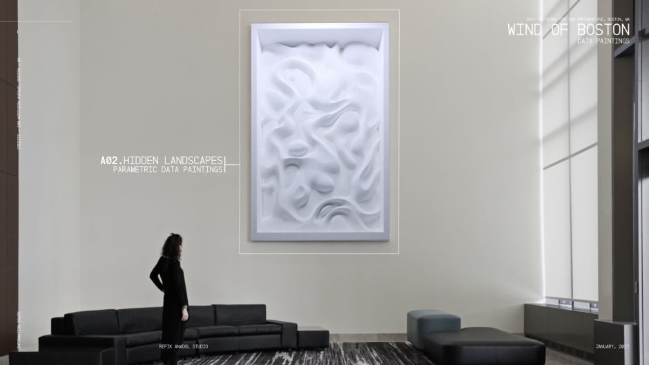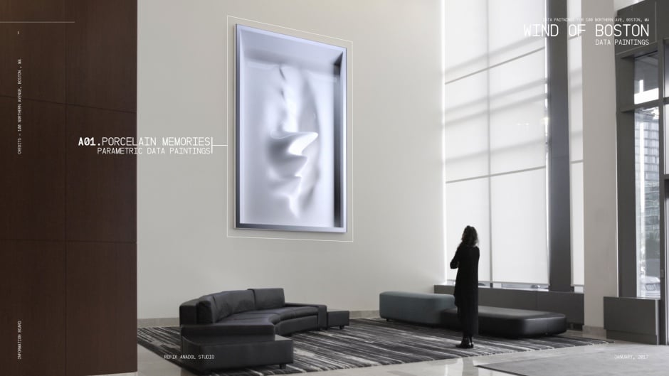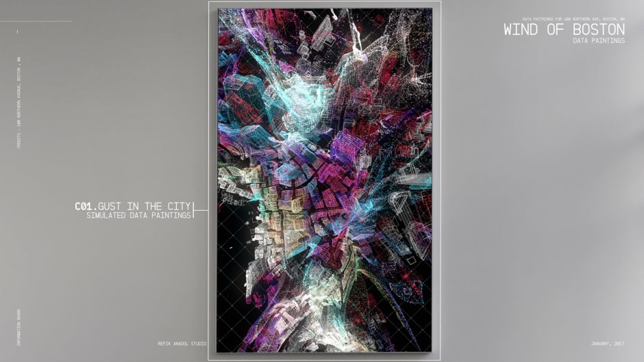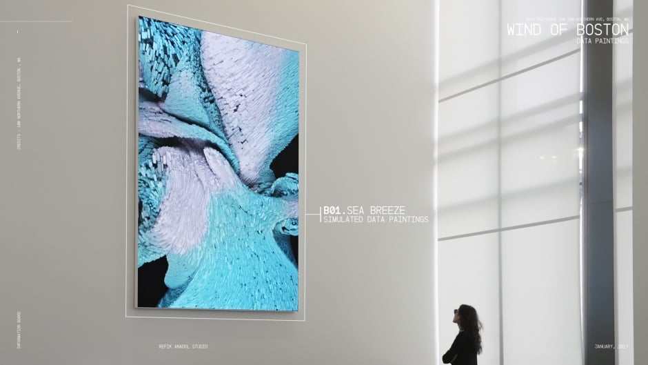 Refik Anadol Stüdyosu, Wind of Boston: Data Paintings başlıklı yerleştirme projesiyle Boston ve çevresindeki rüzgarların görünmez motiflerini görselleştiriyor. Veri 1,8 x 4 m ölçülerinde dev bir dijital tuval üzerinde izleniyor.