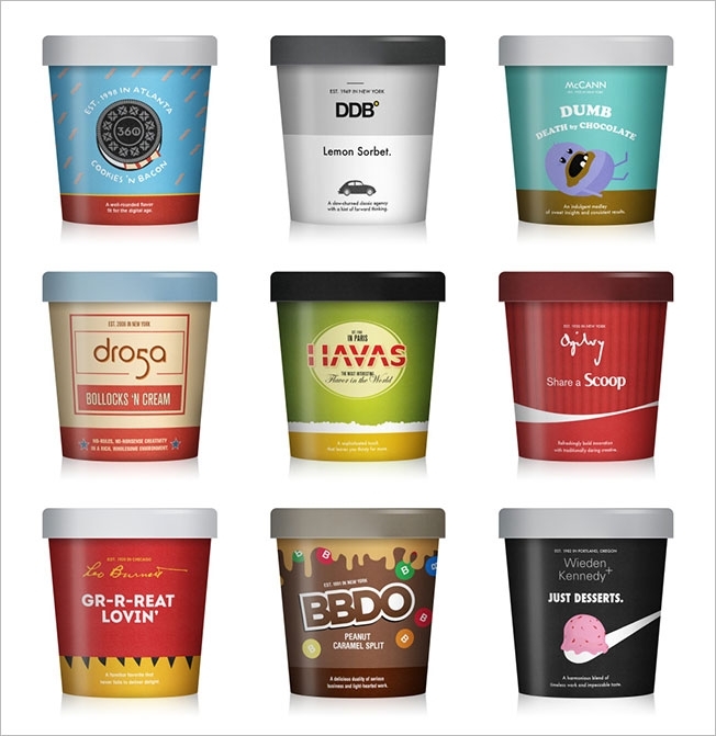 New York’taki Miami Ad School öğrencilerinden Aditya Hariharan ve Joshua Namdar’ın hayata geçirdiği projede, ünlü reklam ajansları kutu kutu dondurmalara dönüşüyor. Ajansların en bilindik işlerinden yola çıkılarak hazırlanan tasarımlar, Hariharan ve Namdar’a bu yaz kolayca birer staj bulduracak kadar eğlenceli ve ince düşünülmüş.