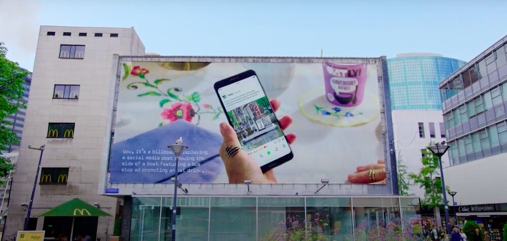 Otobüs durağındaki açık hava reklamının görseli bir teknede kendine yer buluyor. Teknedeki reklam sosyal medya gönderisine, bu gönderi bir açık hava panosuna taşınıyor. Panodaki reklamın önünde piyano çalan kadının gönderisi sosyal medya videosuna, bu videonun izleme anının yer aldığı görüntü kamyona, kamyonun çekilme anının bulunduğu görüntü gazeteye reklam oluyor. Son olarak gazetedeki reklam da duvarda bir murala dönüşüyor.