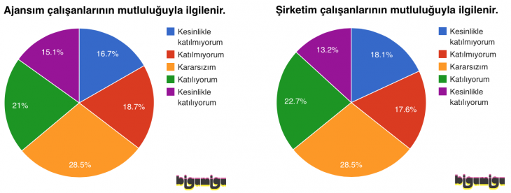 Ajans çalışanlarındaki kararsızlık hali ajanslarının mutluluklarıyla ilgilenmeleri konusunda da hakimdi (%28,5). İkinci yaygın cevap ise daha olumluydu. Zira %21’lik dilim, mutluluklarıyla ilgilenildiğini düşünüyor. Bu kanıya katılmayanlar %18,7, kesinlikle katılmayanlar %16,8 ve kesinlikle katılanlar ise %15,1’lik dilimde. Söz konusu tablo, deneyim ve ajans yapısı değişkenleri olunca birkaç değişiklikle karşılaşıyoruz.