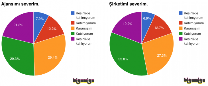 Araştırma kapsamında ajans ve kurumsal çalışanlarından bağlı oldukları şirketin adını gizli tutarak işlerinden aldıkları tatmini ölçen beş maddeyi puanlamalarını istemiştik. Şirketlerinin başarısı, mutluluklarıyla ilgilenmesi, şirketlerini sevmesi, hak ettikleri gelir ve genel iş memnuniyetlerini değerlendiren bu maddeleri 1 (kesinlikle katılmıyorum), 2 (katılmıyorum), 3 (kararsızım/çekimserim), 4 (katılıyorum) ve 5 (kesinlikle katılıyorum) arasında puanlamışlardı.