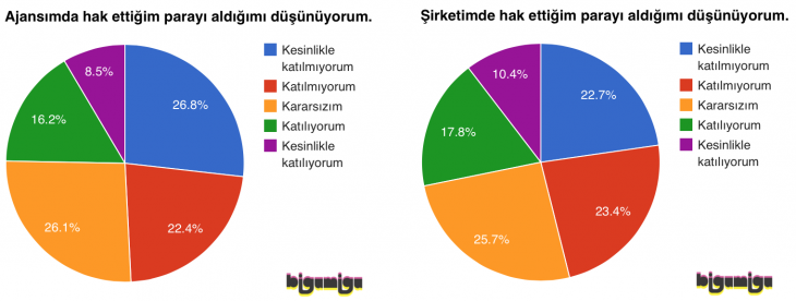 Ajans çalışanlarının çoğu hak ettiği parayı kesinlikle kazanmadığını düşünüyor (%26,8). Kararsızlıklar %26,1, hak ettiği parayı almadığını düşünenler %22,4, hak ettiklerini aldıklarını düşünenler %16,2 ve buna kesinlikle katılanlar %8,5’lik dilimde.