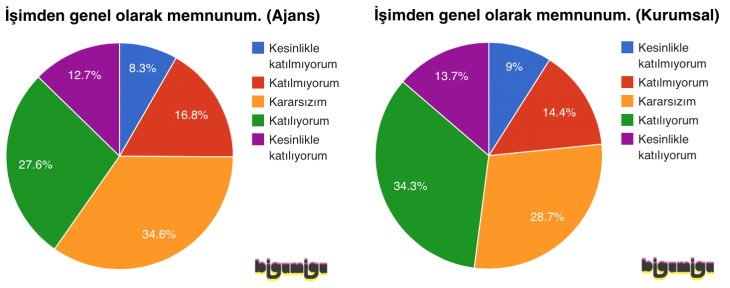 Son olarak genel iş memnuniyetini sorduğumuzda ajanslarda ağırlığın yine kararsızlık içinde (%34,6), kurumsallarda ise genel olarak memnuniyet (%34,3) olduğunu görüyoruz. Ajans çalışanlarından gelen diğer cevapların oranı; memnunlar (% 27,6), memnun olmayanlar (%16,8), kesinlikle memnun olanlar (%12,7) ve kesinlikle memnun olmayanlar (%8,3).