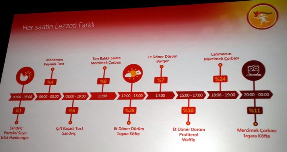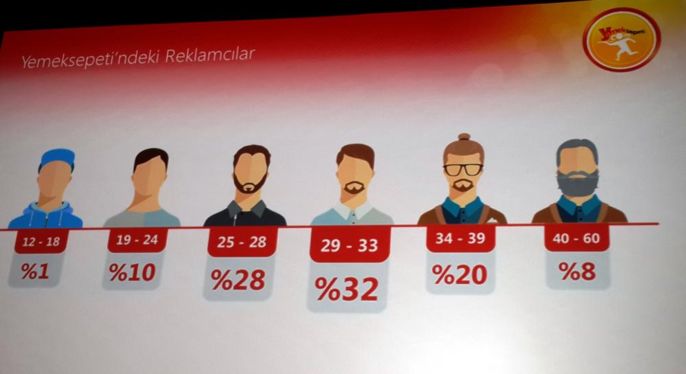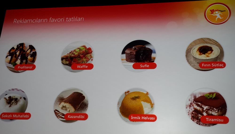 Barış Sönmez’in ortaya koyduğu veriler, son 3,5 ayda reklam ajanslarından verilen 15 bin yemek sparişini esas alıyor. Sparişlerin %42’si kadınlar, %53’ü ise erkekler tarafından verilmiş. Sönmez, Yemeksepeti genelinde kullanıcıların en sık tercih ettiği yiyeceğin kebap ve tatlılardan da künefe olduğuna; reklamcıların ise kebapları ve künefeyi tercih etmediğine dikkat çekti. Çok sık etsiz bamya, fava vb eşine az rastlanır sparişler veren şaşırtıcı ajanslar da olduğunu ancak bunun biraz da ajans yakınlarında bu yiyecekleri güzel yapan restorantlar olmasından kaynaklı olabileceğini belirtti. Ajanslara verilen spariş saatlerine bakıldığında ise reklamcının çoğunlukla akşam saatlerinde çalışıyor olduğu, akşam yemeğini evde yiyemediği görülüyor.