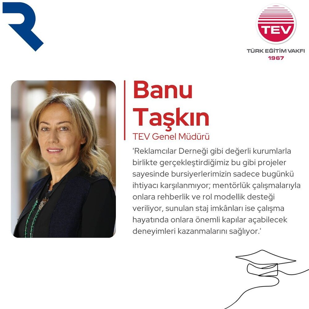 TEV Genel Müdürü Banu Taşkın’ın açıklamaları ise şöyle: “Türk Eğitim Vakfı olarak gençlerimizi geleceğin teminatı olarak görüyor ve bu nedenle eğitimde fırsat eşitliği konusuna özel olarak odaklanıyoruz. Öğrencilerimize yalnızca maddi destek sağlamanın ötesine geçmeyi; onların iyi bir eğitim almalarını, bilinçli ve donanımlı bireyler olmalarını sağlayacak projeleri hayata geçirmeyi önemsiyoruz. Kurumsal iş birliklerinde dikkat ettiğimiz konuların başında, öğrencilerimizin geleceğe dair ihtiyaçlarını da anlayabilmek ve onları tüm eğitim yolculuklarında destekleyebilmek geliyor. Reklamcılar Derneği gibi değerli kurumlarla birlikte gerçekleştirdiğimiz bu gibi projeler sayesinde bursiyerlerimizin sadece bugünkü ihtiyacı karşılanmıyor; mentorluk çalışmalarıyla onlara rehberlik ve rol modellik desteği veriliyor, sunulan staj imkânları ise çalışma hayatında onlara önemli kapılar açabilecek deneyimleri kazanmalarını sağlıyor. Oluşturdukları burs fonu ile afetzede öğrencilerimize çok yönlü ve sürdürülebilir bir destek sunan Reklamcılar Derneği’ne, öğrencilerimizin hayat yolunu aydınlatmadaki katkıları için bir kez daha şükranlarımızı sunarız.”