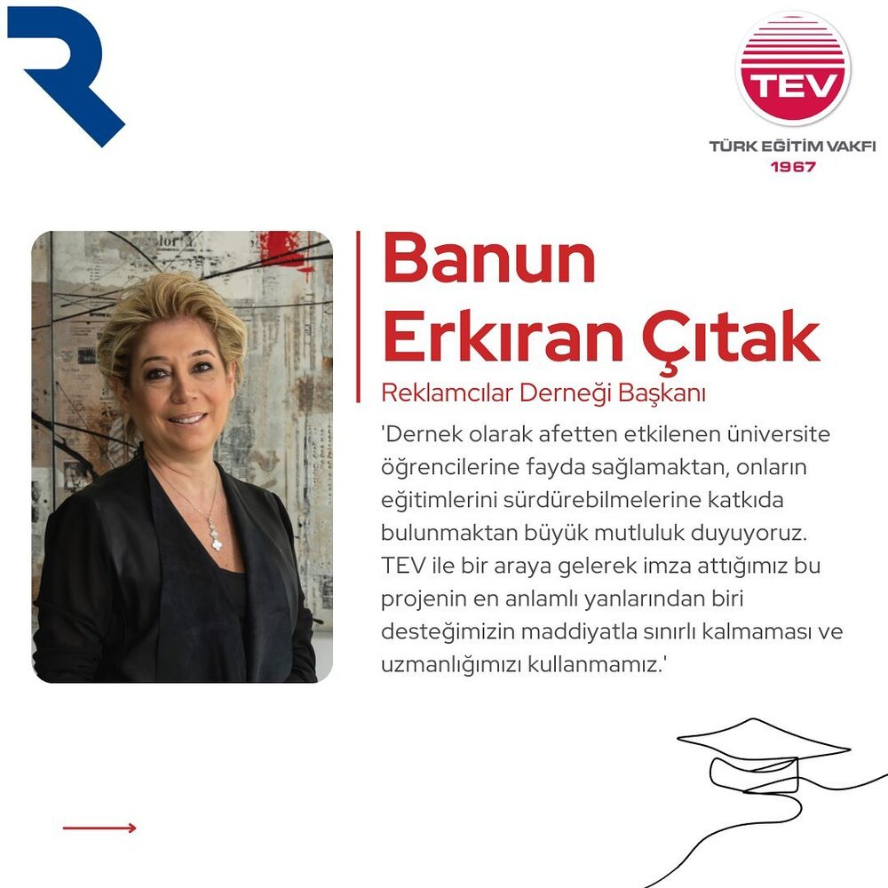 Reklamcılar Derneği Başkanı Banun Erkıran Çıtak, burs fonu ve Mentorink programıyla ilgili olarak şu açıklamaları yaptı: “Dernek olarak afetten etkilenen üniversite öğrencilerine fayda sağlamaktan, onların eğitimlerini sürdürebilmelerine katkıda bulunmaktan büyük mutluluk duyuyoruz. TEV ile bir araya gelerek imza attığımız bu projenin en anlamlı yanlarından biri desteğimizin maddiyatla sınırlı kalmaması ve uzmanlığımızı kullanmamız. İletişim fakültesi öğrencilerimizin kariyer gelişimlerine katkıda bulunmak adına mentorluk sürecini başlattık. Sektör profesyonellerinden oluşan gönüllülerimiz gençlerle sürekli yakın temasta olacaklar. Öğrencilerimizin kariyer gelişimlerine katkıda bulunmak ve çalışma hayatına ısınmalarını sağlamak için staj imkânı sağlamayı da önemsiyoruz. Son olarak Reklamcılar Derneği üyelerinin ve reklam, pazarlama sektörünün de katkıları ile bu fonu büyütmeyi ve sürdürülebilir kılmayı hedefliyoruz.”