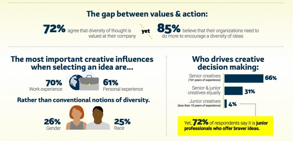 Bildik bir konu daha, katılımcıların %72’si junior’ların daha cesur fikirlerle geldiğini söylerken yaratıcı karar sürecini yönlendiren kişiler de %66 oranında 10 yılın üzerinde deneyime sahip yaratıcılar. Stajyer ya da junior iken kendini duyuramamış, gayet yaratıcı fikirlerini bir türlü satamamış genç reklam yaratıcısını hepimiz tanıyoruz, hatta kendisi dünyanın en bildik insanı olabilir bu sektörde çalışmış olanlar için. Ancak; genç bir yaratıcının fikirlerini kucaklamak ve farklı olana yönelmek de yankı odası etkisinden kurtulmak adına önemli bir adım olabilir.