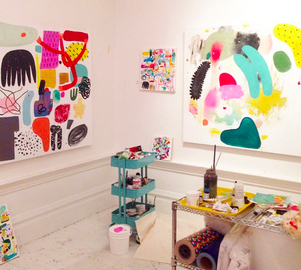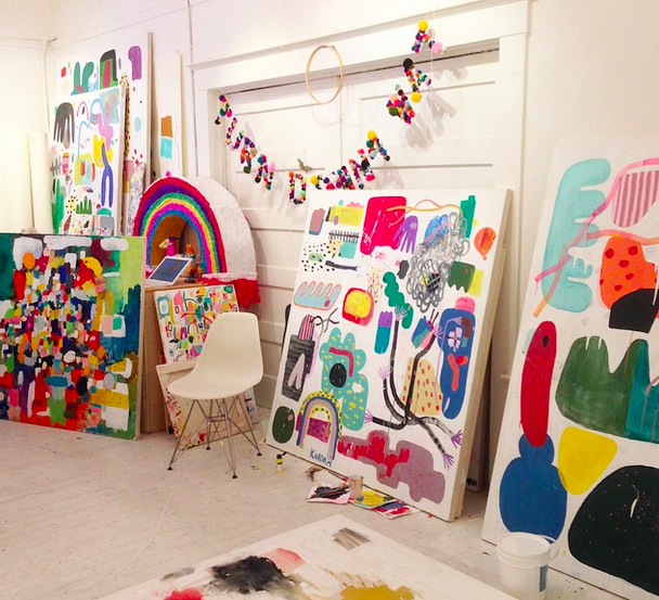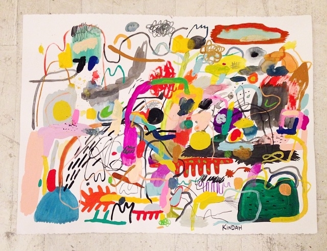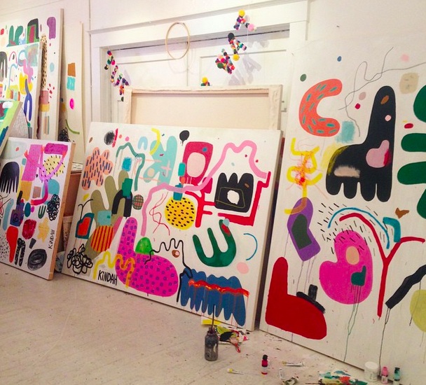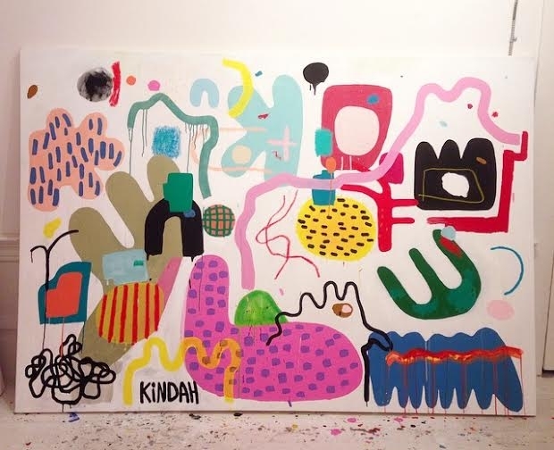 Ressam ve tekstil tasarımcısı Kindah Khalidy’nin bazen büyük tuvallere bazen de kağıtlar üzerinde yarattığı rengarenk kompozisyonlar, şekere bulanmış soyut bir tarz barındırıyor. Khalidy, bu kompozisyonlara ilham sebebi olan duygular ve diğer soyut öğeleri tuvale yapıştırıp iki boyuta indirgemeyi başarmış.