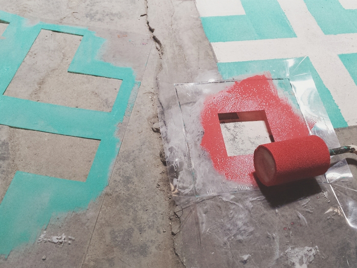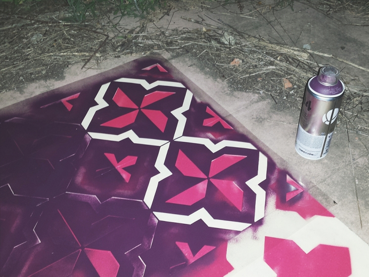 Barselonalı sanatçı çalışmaya ilk olarak desenlendireceği alanı olduğu gibi tek renge boyayarak başlıyor. Sonrasında üzerine şablon kalıplarını (stencil) koyarak, boyamaya devam ediyor.