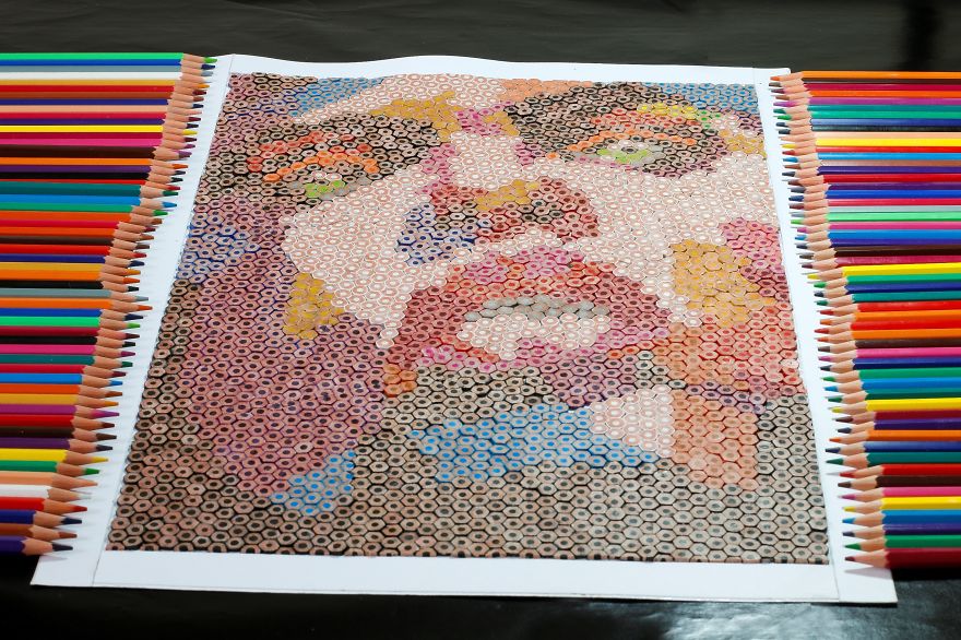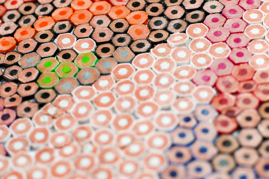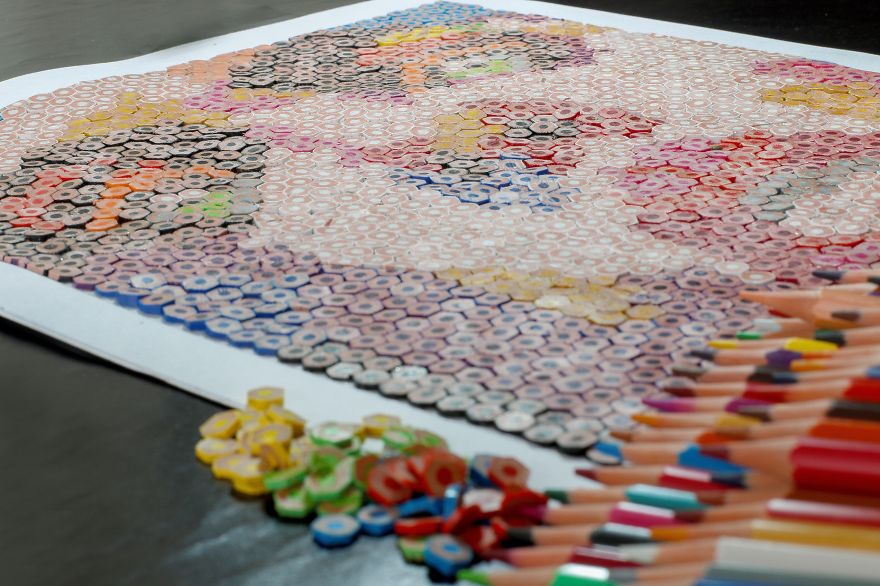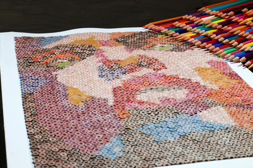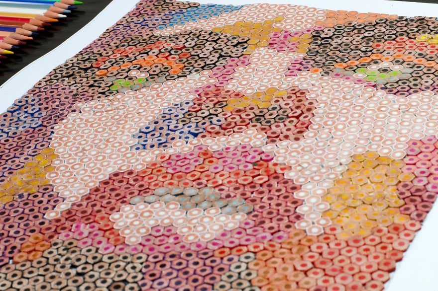 Brezilyalı sanatçı Thiago Fernandes, renkli kalemlerle harika bir tablo oluşturuyor. Renkli kalemleri minik minik parçalara ayıran ve oluşturacağı eserin taslağını çizdiği kağıda incelikle tek tek yapıştırıyor. Sanatçının ‘Iris’ ismini verdiği tablosunu hazırlamak yaklaşık olarak 100 saatini almış.