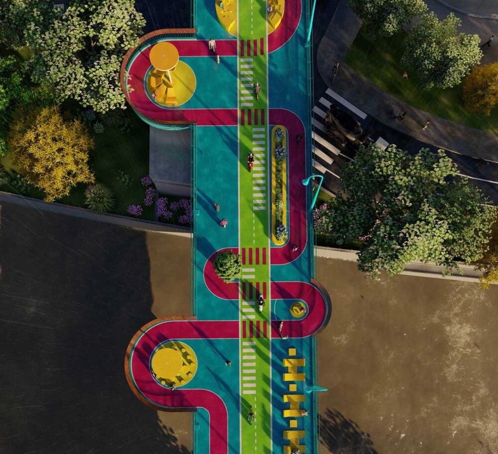 Fuşya renkli alanların yürüyüş yapmak isteyen yayaların, yeşil alanların ise e-scooter ve bisikletlilerin kullanımına ayrıldığı High Loop’un toplam uzunluğunun 1 km olacağı öngörülüyor.