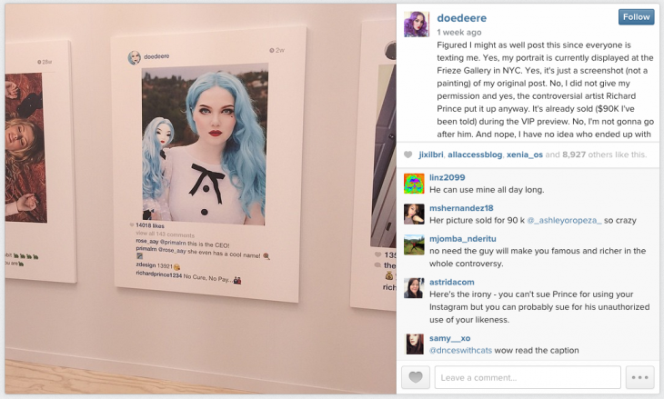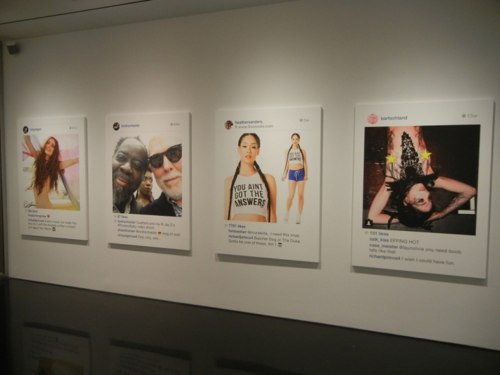 New York Frieze Gallery açtığı kişisel sergisinde birtakım insanların Instagram fotoğraflarının ekran görüntülerini ziyaretçilerle buluşturuyor. Aralarında 900 bin dolara satışı yapılan bir eserin olduğu da konuşulurken serginin aldığı en büyük tepki kuşkusuz eserlerin temelini, hatta tamamını, başkalarının fotoğrafları oluşturması ve Prince’in bu kişilerden kullanım için izin alınmaması.