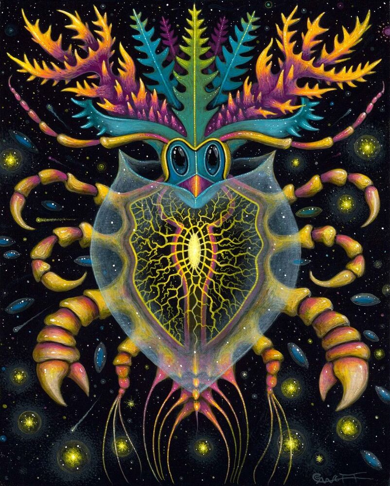 Los Angeles merkezli sanatçı, resimlerinde gizemli ve saykodelik ekosistemler yaratıyor. Üstelik bu hayali sistemleri titiz ayrıntılarla inşa ediyor; farklı floralar ve faunalar tasarlıyor. Kompozisyonlardaki canlıların pek çoğu deniz canlılarına has özellikleri taşıyor.