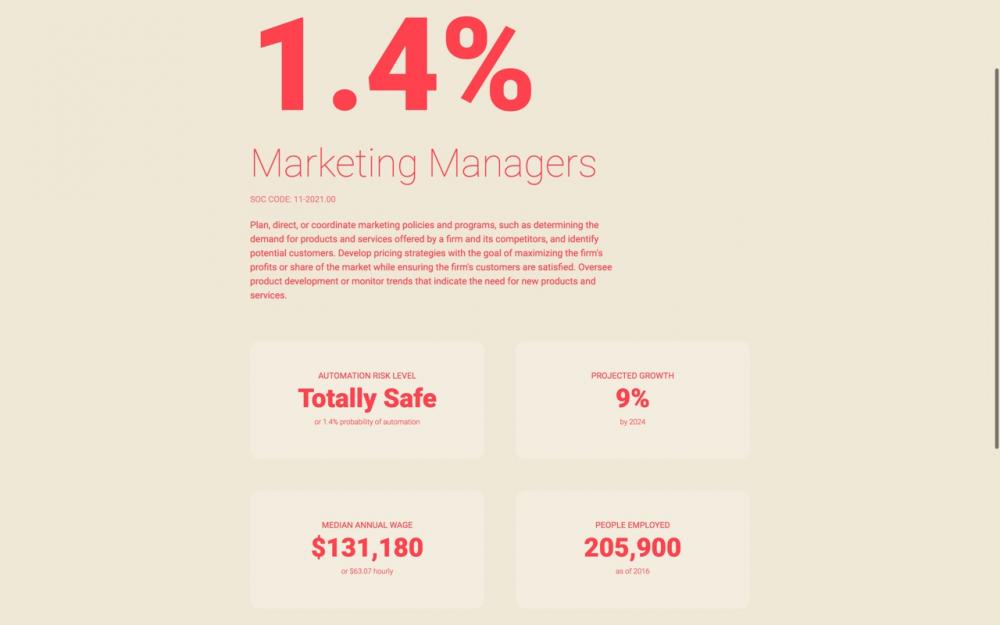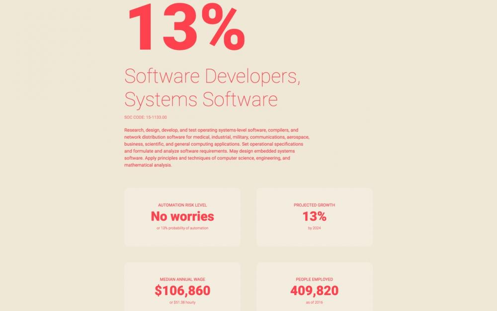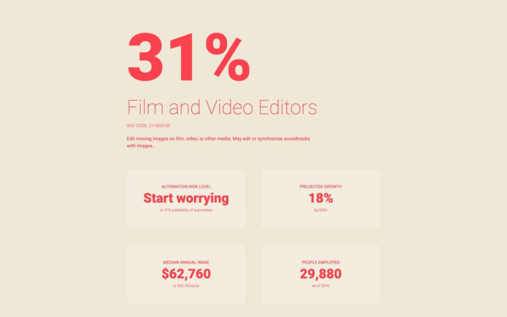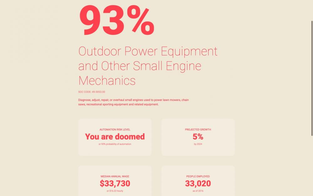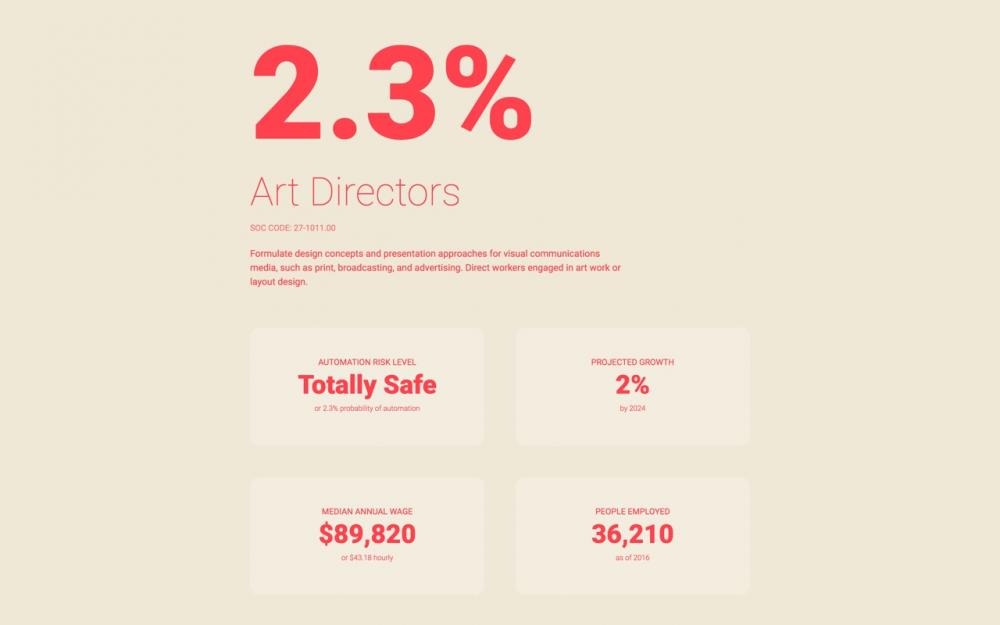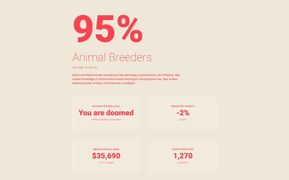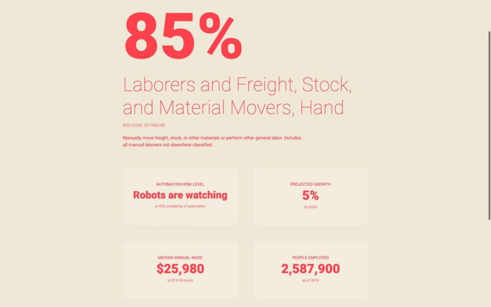 Mubashar Iqbal‘in geliştirdiği ve Dimitar Raykov‘un tasarladığı willrobotstakemyjob.com.com, meslek gruplarıyla robotlar arasındaki ilişkiyi inceleyerek hangi sektörlerin gelecekte robotlara devredileceğini listeliyor. Basit bir arama motoru gibi çalışan siteye mesleğinizi yazıyorsunuz ve bu uzmanlığın ne kadar otomatikleştirilebileceğinin yanıtını alıyorsunuz.
