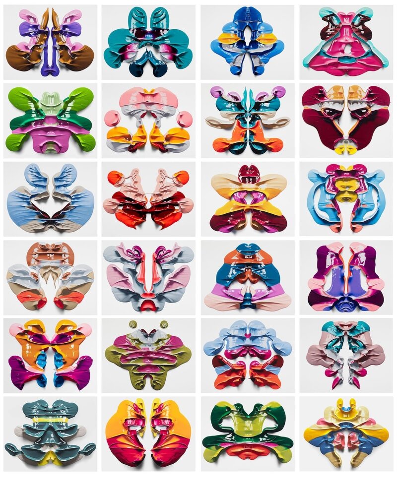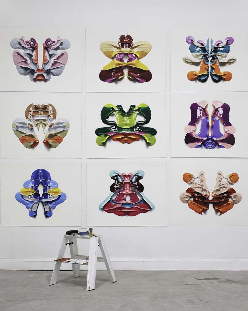 Cj Hendry’nin çalışmaları, ilk bakışta kalın yağlı boya katmanlarıyla boyanmış resimler gibi görünebilir. Aslında bunlar, renkli kuru boyalarla yapılmış çizimler. Sanatçı yıllardır, boya katmanı gibi duran çizimler yapıyor. Ancak Rorschach başlıklı bu yeni serisiyle, çalışmalarına psikolojik bir katman da eklemiş.