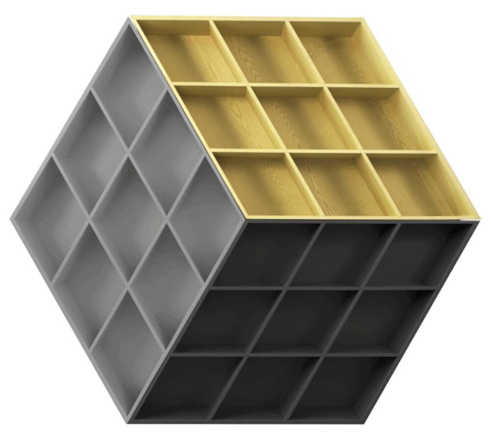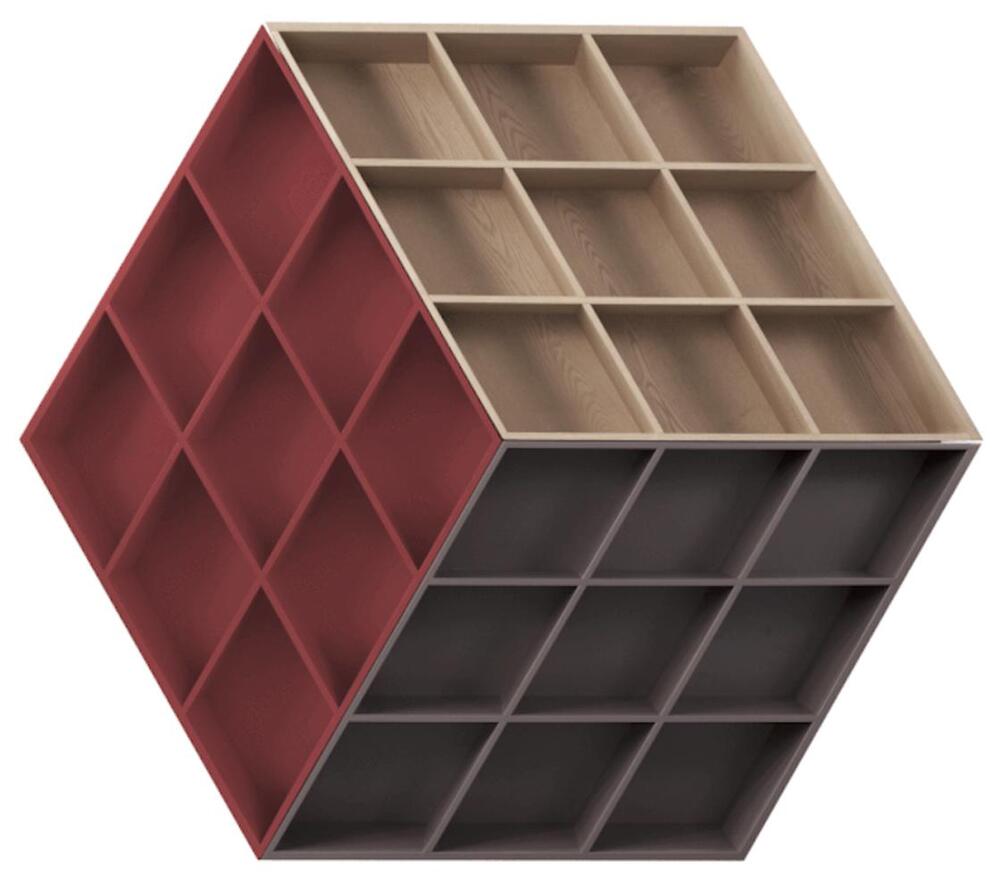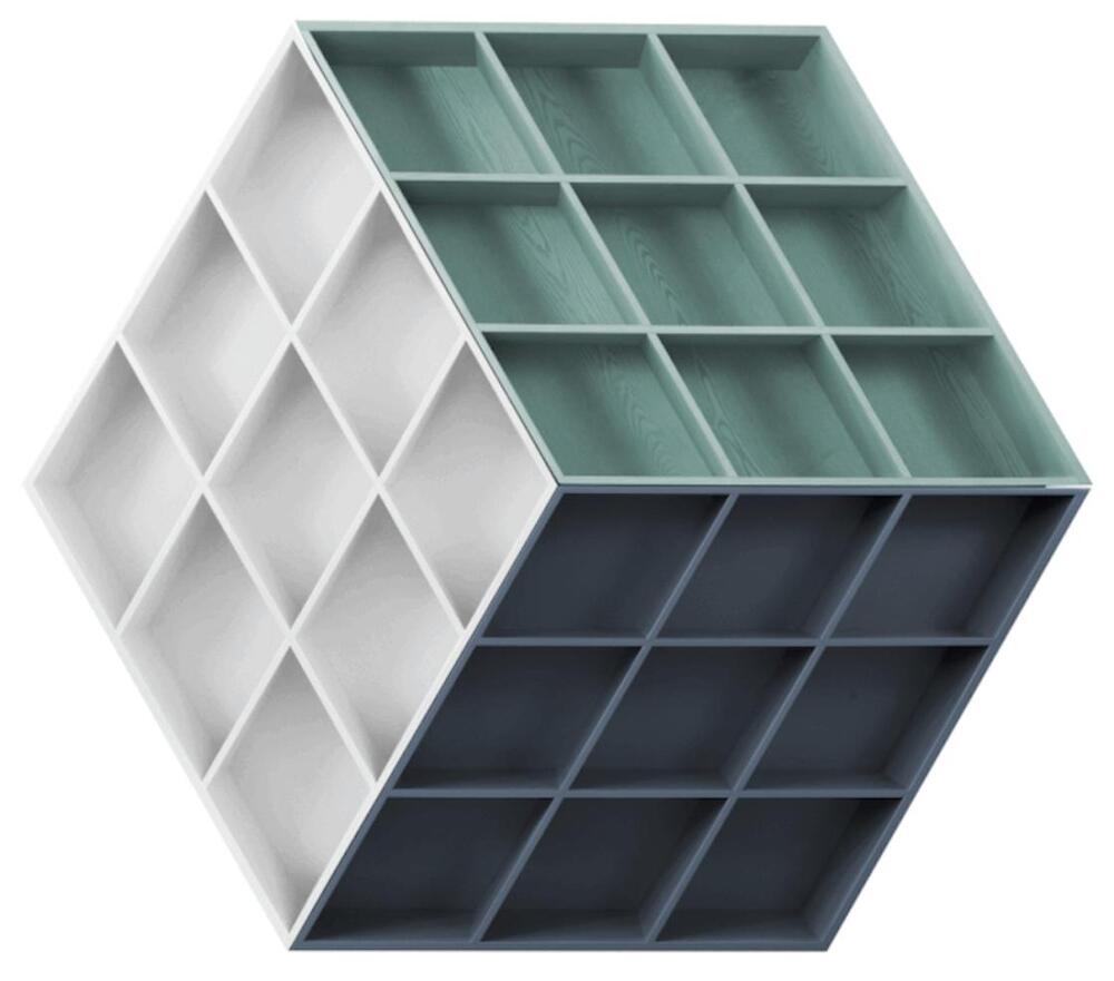 3 renkli ahşap yüzeyi ile küp yanılsaması yaratan Rubika, aslında tamamı aynı düzlemde bulunan 3 farklı dörtgenin yan yana gelmesinen oluşuyor. Rubik küpü daha çok 80’li yıllarda popüler olan bir obje olduğundan kitaplık bulunduğu ortama nostaljik bir hava katıyor. Rafları farklı açılara sahip olduğundan kitapların yanı sıra şarap şişelerinizi, çiçeklerinizi ve sık kullandığınız diğer günlük eşyalarınızı da rahatlıkla bulundurmanıza imkan veriyor.