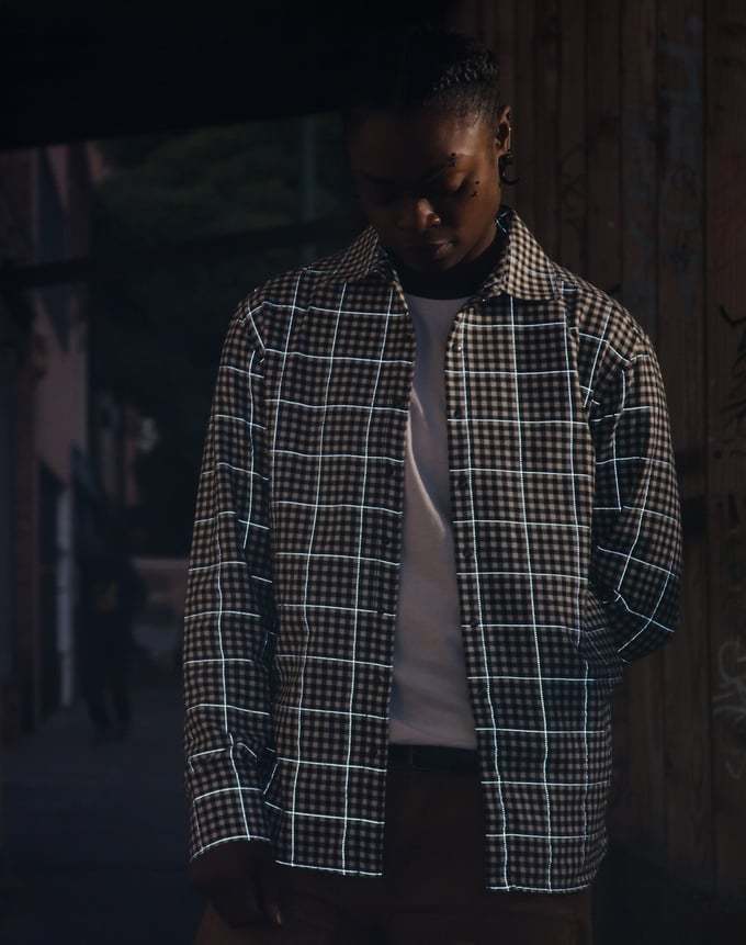 Retroreflektif dediğimiz nedir derseniz, ismi çok teknolojik de dursa aslında değil, sadece bir tekstil terimi. Özel bir teknik kumaşın normal kumaşla birlikte örülmesiyle oluşuyor. Yüzeysel baskı yapılan çoğu yansımalı kumaşın aksine bu kumaş kendinden yansımalı olduğu için ışığını kaybetmiyor. RS01 bu nedenle dayanıklı ve parlak bir yansıma sağlıyor. Yansımayı yaratan öğe ekose desenin içine saklandığından gün içinde devreye girmiyor ama karanlıkta vazifesini hakkıyla yapıyor.