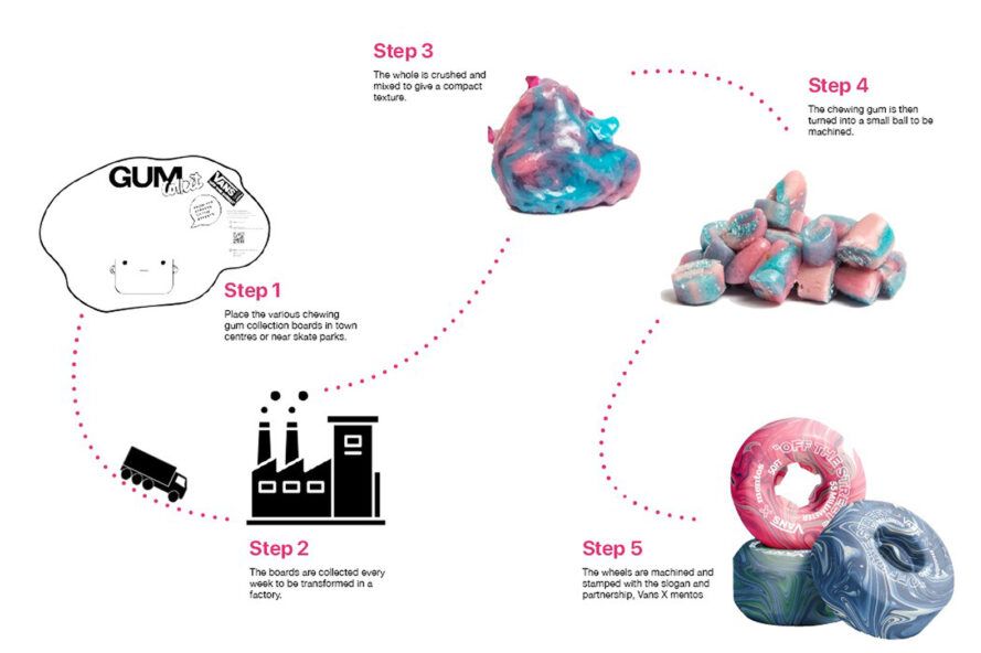 Öğrenciler, kentlerde belli noktalara şirin mi şirin sakız panoları yerleştirmeyi planlıyor. Hatta üniversitenin bulunduğu şehir olan Nantes’te çoktan prototipleri yerleştirmişler. Panolar, kent sakinlerinden sakızlarını yere atmak yerine buraya yapıştırmaya davet ediyor. Maupetit ve Fischer, insanları teşvik etmek için kaykay tekeri almak istediklerinde indirimli alışveriş yapabilecekleri bir piyango konsepti de eklemiş projeye. Üzerlerine sakız yapıştırılan panoların her hafta toplanması ve bir fabrikada tüm küçük sakız parçalarının ezilerek işlenmesi planlanmış. İşlenen sakızlar tekere dönüştüğünde de “VANS x Mentos” damgasıyla üretim bandından çıkacak.