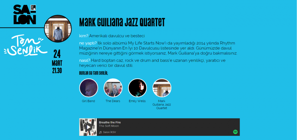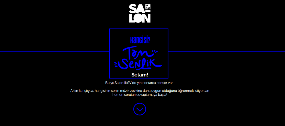 Müziksevelerin de farklı deneyimler yaşayacağı bu konserler arasından en çok ilgisini çekecek ve keyif alacağı konserleri seçmek için Salon İKSV, Tam Senlik isimli 8 soruluk bir anket hazırlamış. Salon’daki onlarca farklı müzisyen arasından karakterinize en uygun etkinliği seçmek için nasıl dans ettiğiniz, nasıl atmosferlerde huzur bulduğunuz ve kahvaltı alışkanlıklarınız gibi günlük hayata dair sorulara yanıt veriyorsunuz. Ve Salon’daki size hitap eden etkinlikler listeleniyor.