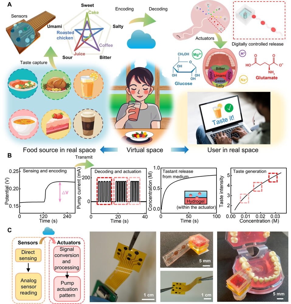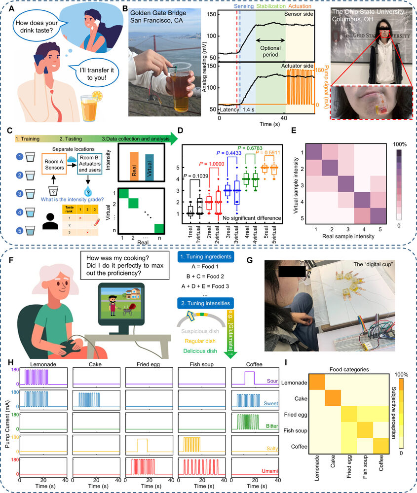 Sanal yemeğinizi aldığınızda, e-Taste kendi aromalarını karıştırarak tarifi pişiriyor ve karışımın birkaç damlasını doğrudan dilinize bırakıyor. Tatlar, çevrim içi bir bağlantı aracılığıyla uzaktan salınabiliyor.