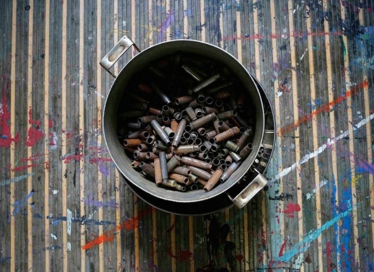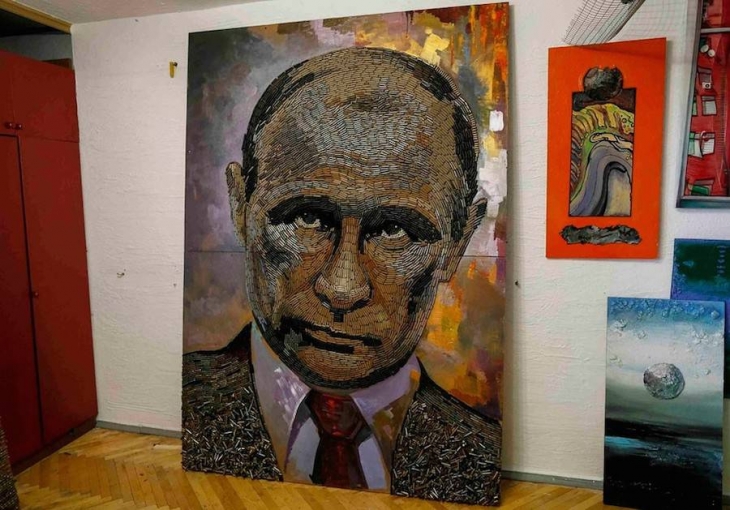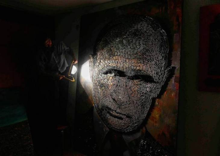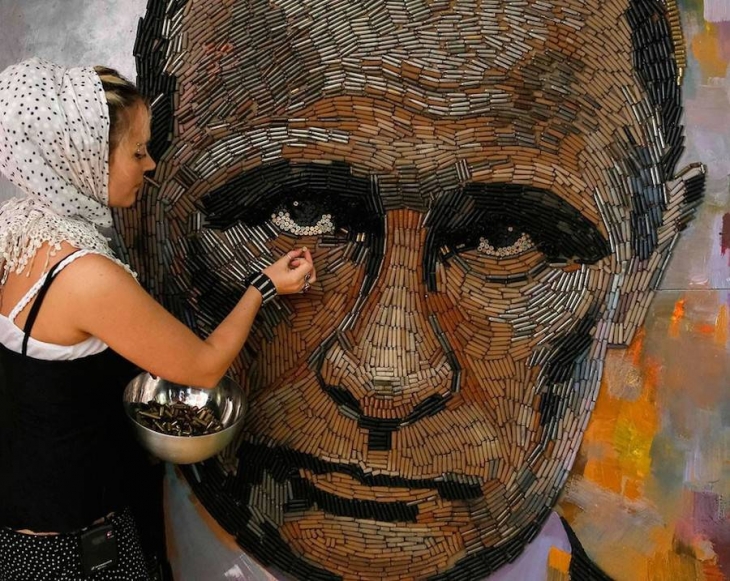 Ukraynalı sanatçı Dariya Marchenko, savaşın sorumlusu olarak gördüğü Vladimir Putin’in portresini resmettiği “The Face of War” (Savaşın Yüzü) isimli çalışmasını, Ukrayna ordusu ve Rusya yanlıları arasındaki çatışmalar sırasında kullanılan mermilerin kovanlarını kullanarak hazırlamış.