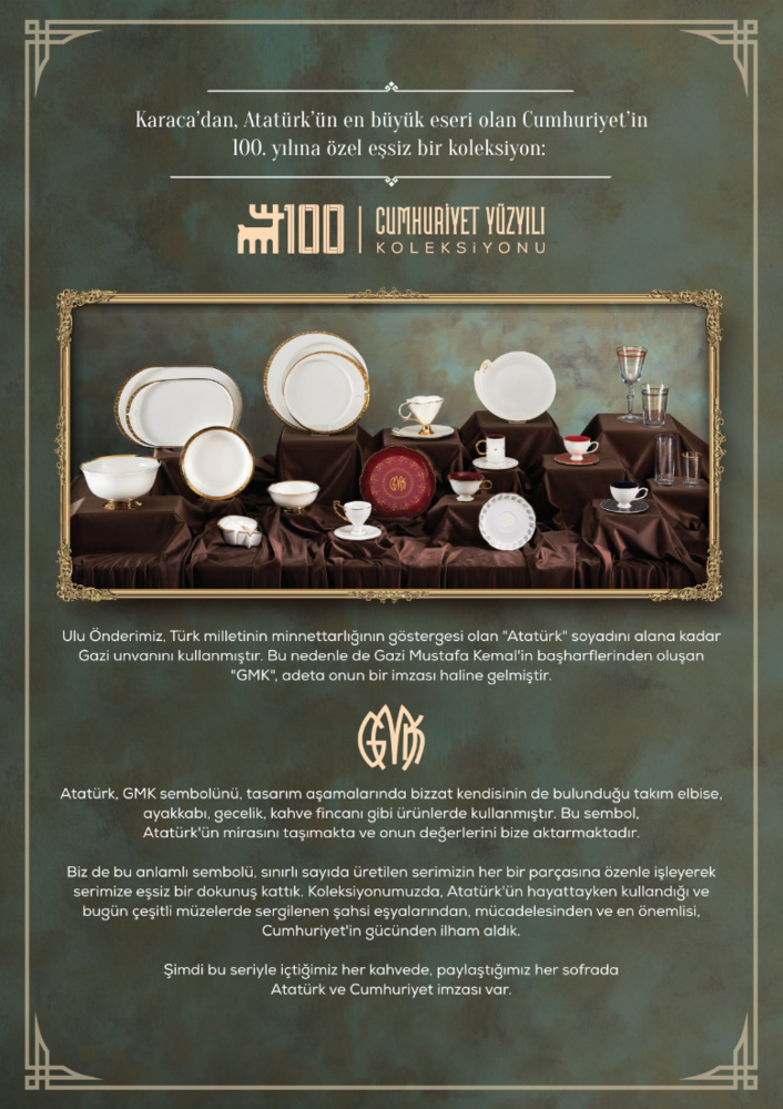 Filmde yer verilen Cumhuriyet Yüzyılı Koleksiyonu, Cumhuriyetin kuruluş döneminin ruhunu yansıtan parçalardan oluşuyor. Marka koleksiyon için “Yüz Yıllık Cumhuriyet’in anısına Yüz yıl saklanacak parçalar” ifadelerini kullanmış. Parçaların isimleri de “Cumhur Espresso Fincanı”, “Egemen Kahve Fincanı Seti” gibi isimlerden oluşuyor. Tasarımlar, isimleriyle ilgili sembolleri içeriyor. Örneğin Cumhur Espresso Fincanı, cumhurbaşkanlığı forsundaki 16 yıldızdan ve Atatürk’ün 6 temel ilkesinden ilham alıyor.